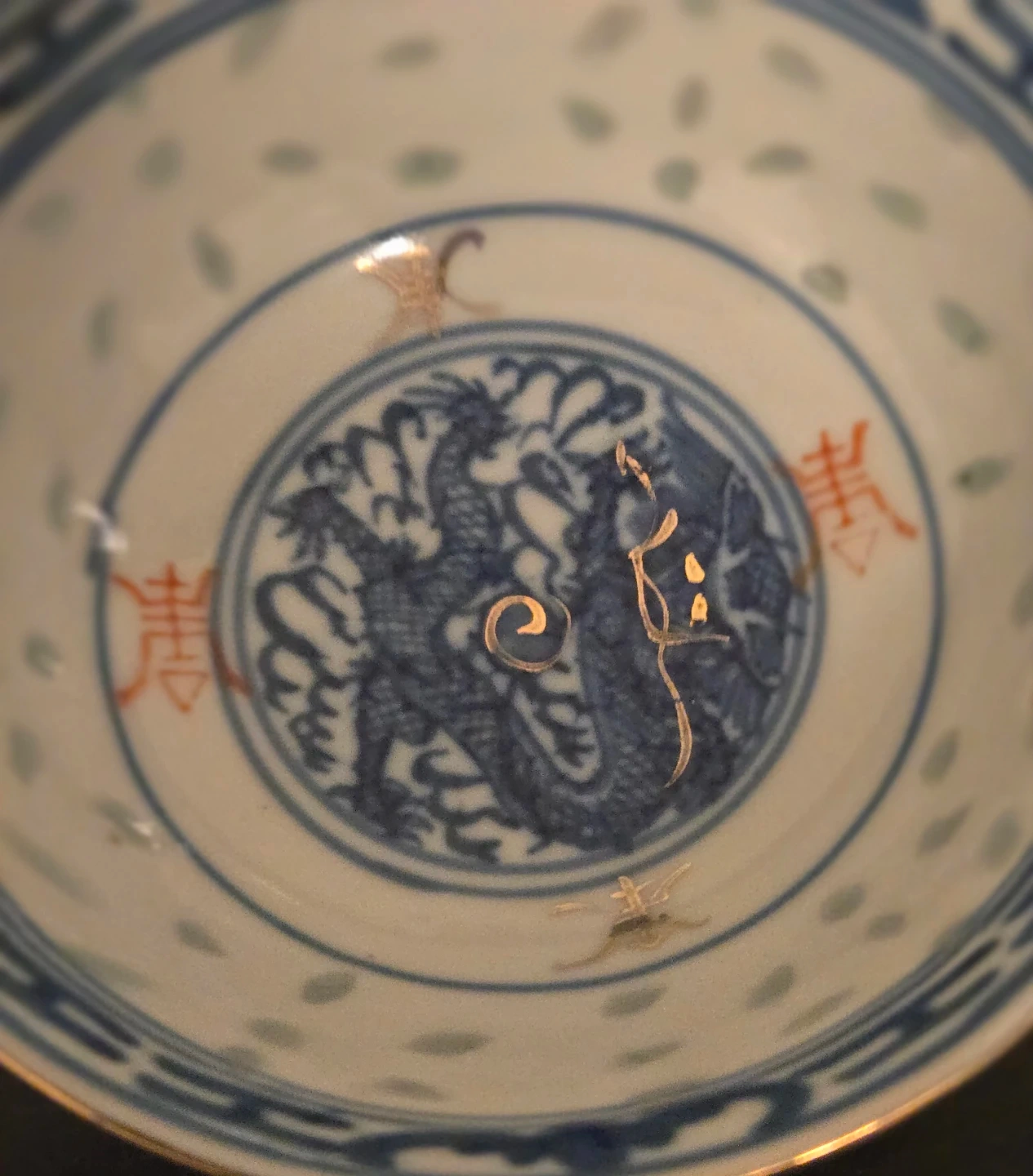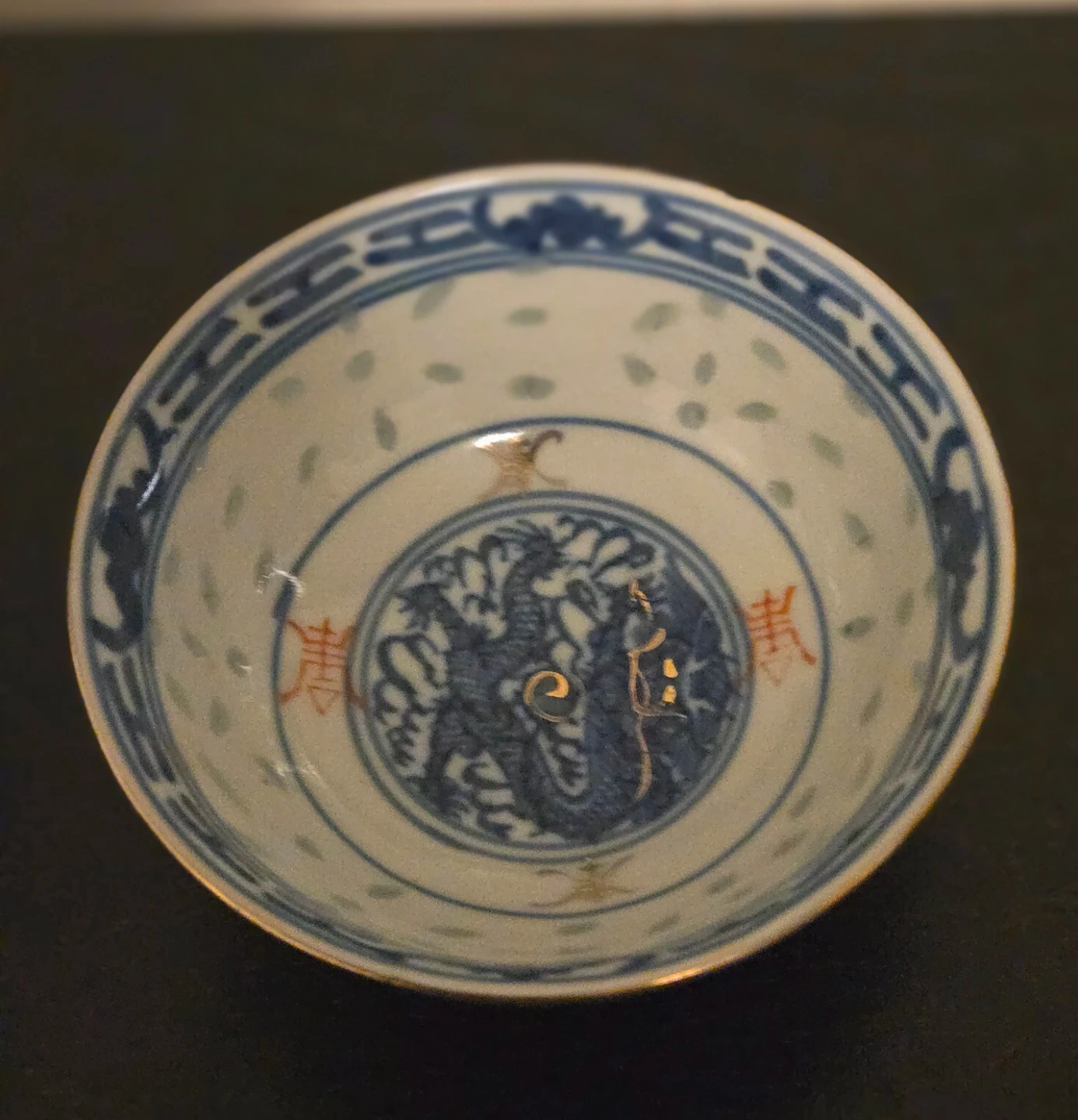 Vintage 1914-1940 Rare Size 3 1/2" Chinese Wanyu Translucent Rice Eye Dragon Pattern Gold Trim Bowl.Wanyu Markings on Bottom. This Rice Pattern Features Translucent Spots were Rice was put in the Clay before Firing then Burns Away Leaving a delicate light transmitting Pattern. Really Nice Wanyu Piece. Like New Condition, Other than a Tiny Chip in Gold Rim. So Small it's not Noticeable unless pointed out. There are many Similar bowls up for sale, Majority are 1950-1970 in a 4 1/2" or Larger size. The Early 1900's Dragon Bowl 3 1/2" size with Gold Trim are Very Rare. GREAT PRICE..ASKING $40 FIRM.