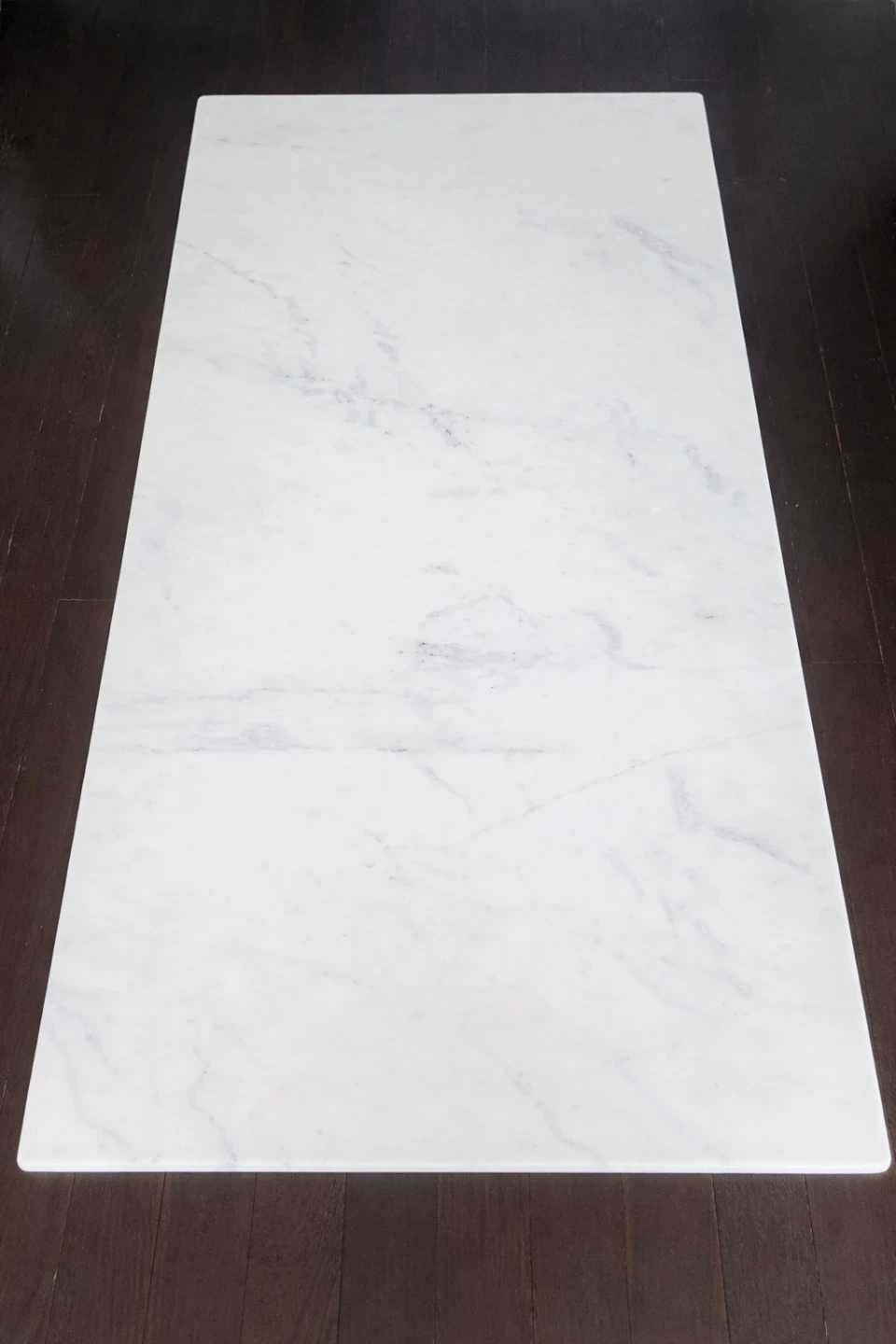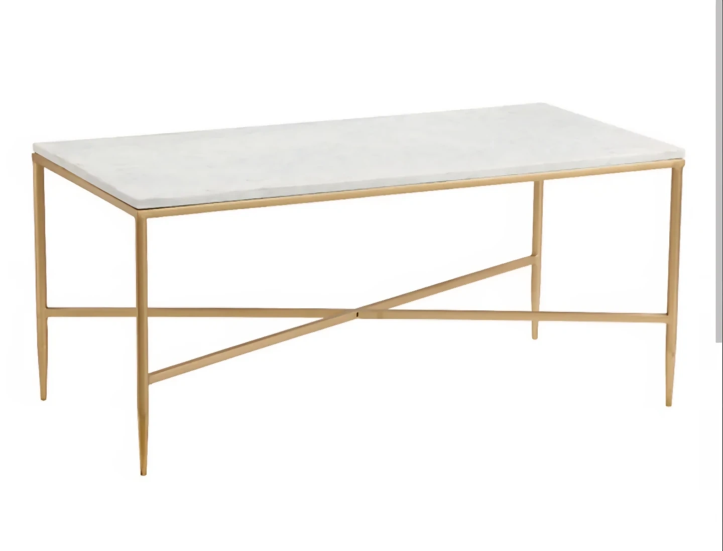 Stylish coffee table from West Elm with a white marble top and a modern gold metal base. Made in India. It's perfect for adding a touch of elegance to your living room. The table's dimensions are 48 inches long, 24.5 inches wide, and 16 inches tall. Great for placing drinks, books, or decorative items.