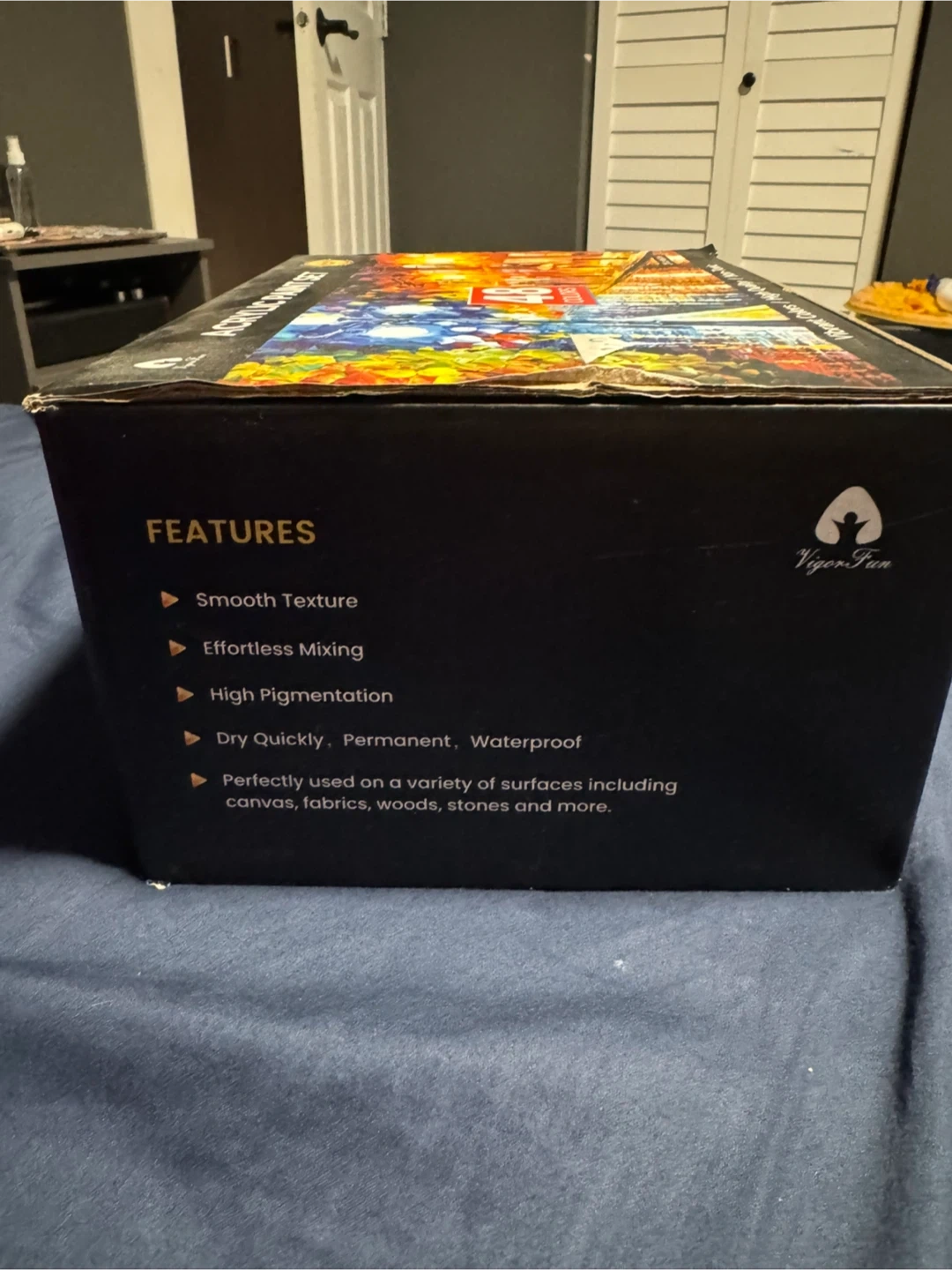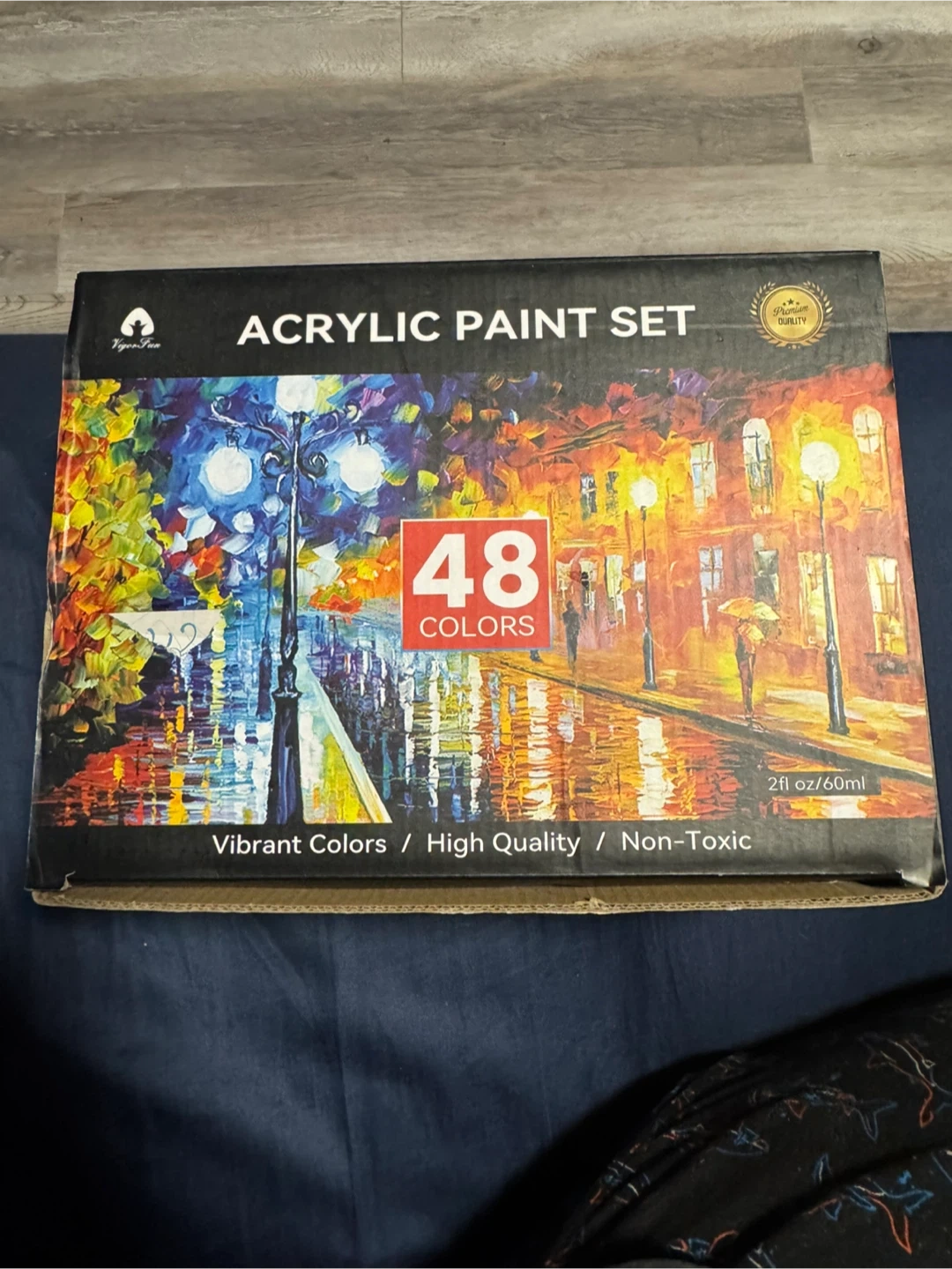 Selling a YgonFun Acrylic Paint Set with 48 premium colours! The set features vibrant colours and high-quality, non-toxic paints. The paints have a smooth texture, allow for effortless mixing, and dry quickly. They are permanent and waterproof, perfect for various surfaces including canvas, fabrics, woods, and stones