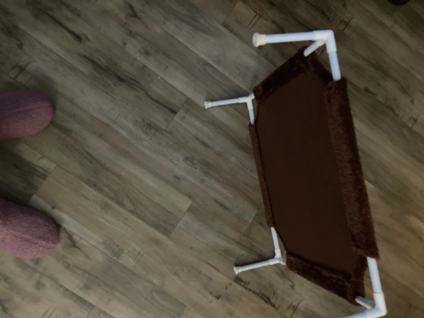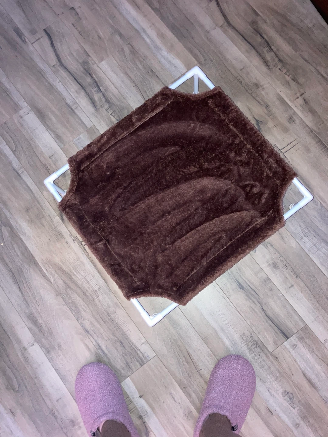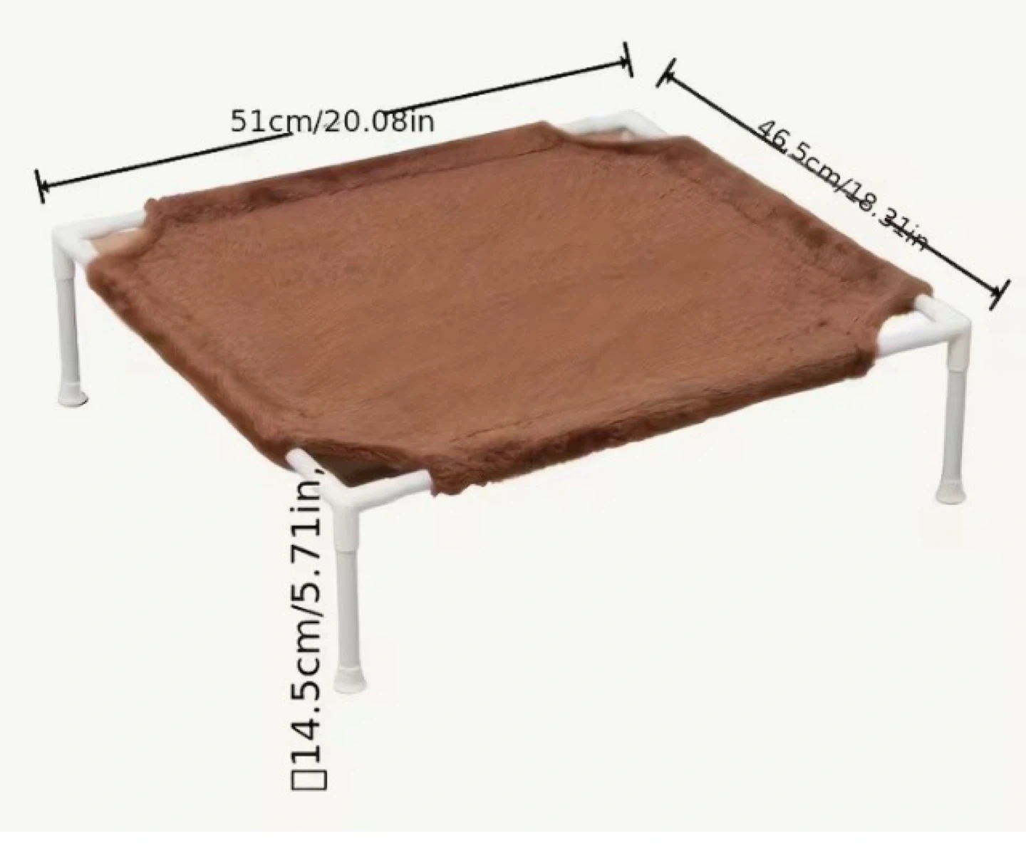 This is an elevated pet bed with a soft, brown fabric surface. It's a good size for a cat or small dog. The frame is made of white PVC pipe and it stands 14.5cm off the ground. Dimensions are 51cm x 46.5cm.
