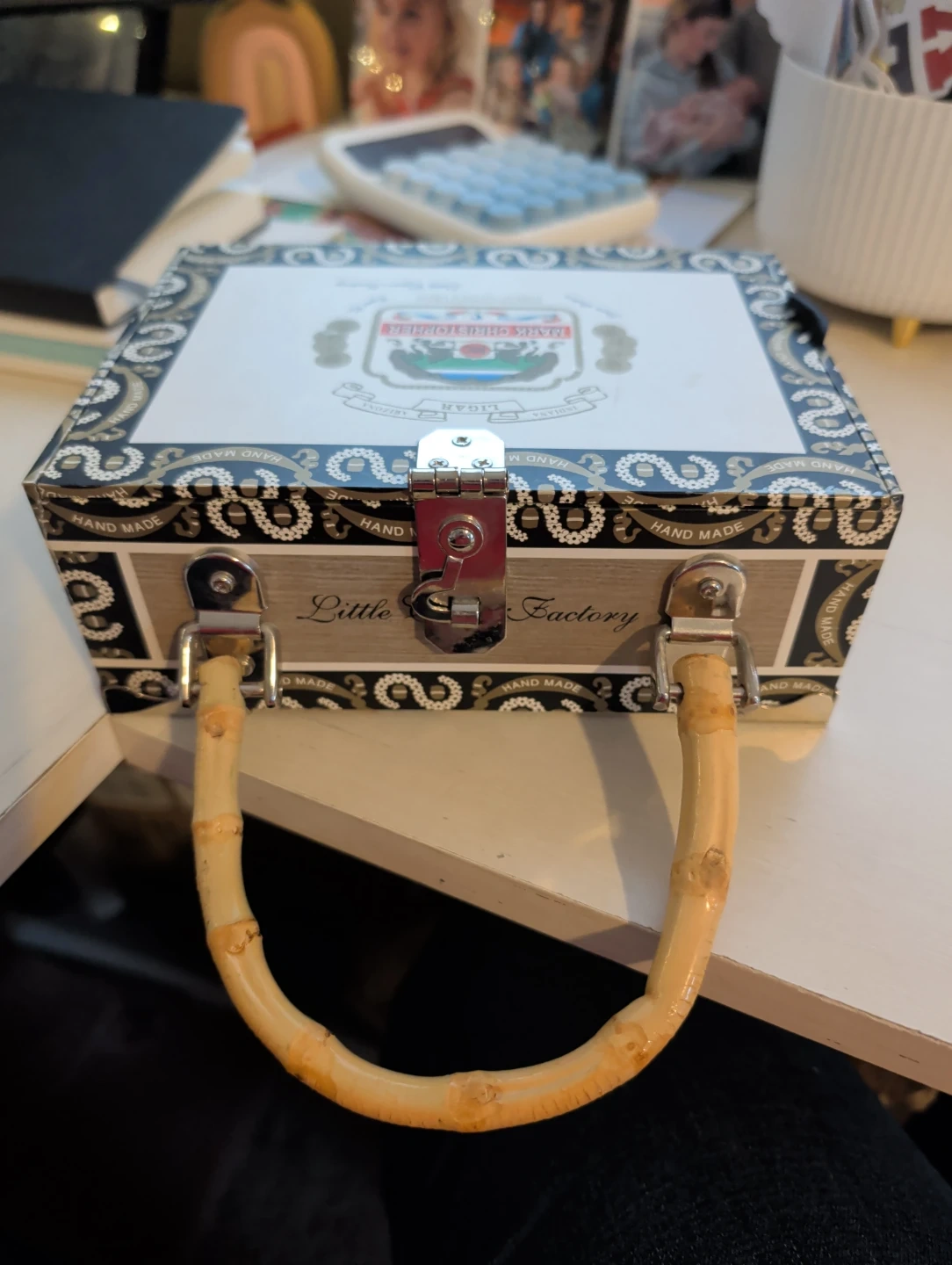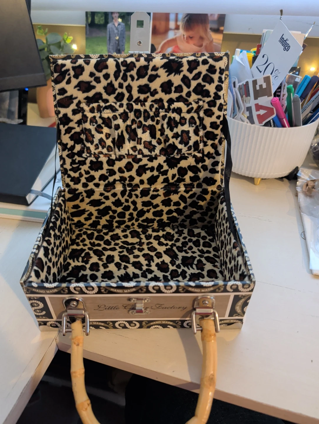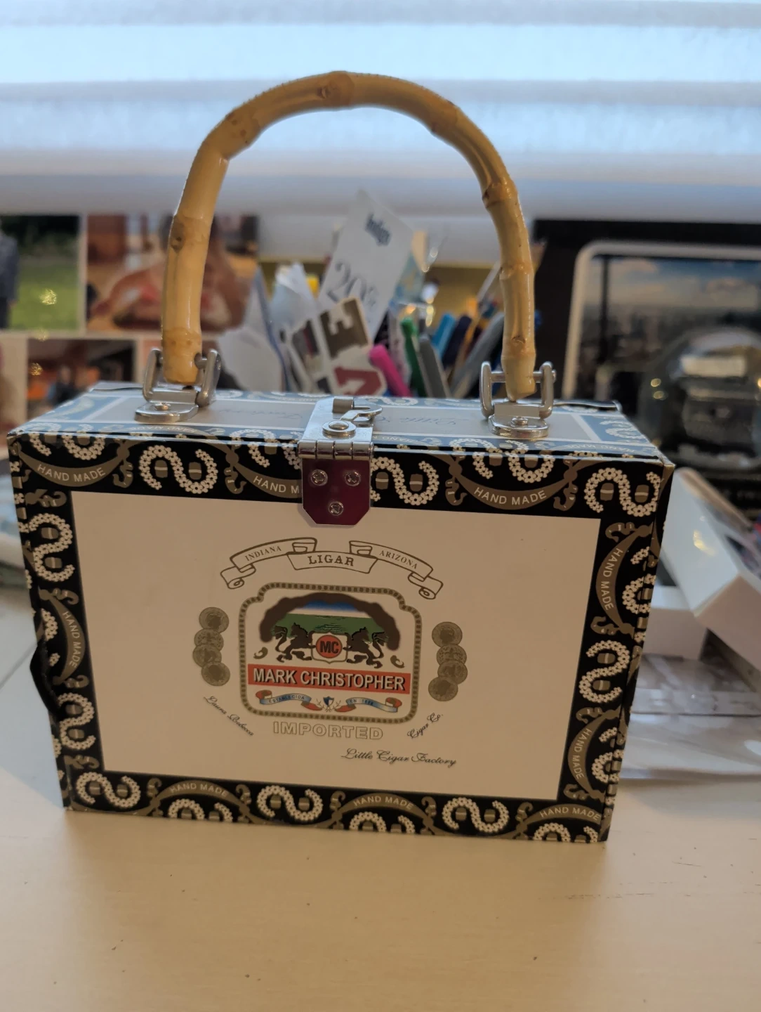 This is a unique, novelty handbag made from a cigar box. It features a stylish leopard print lining and a bamboo handle. It's perfect for a night out or as a statement piece. The bag closes with a secure metal clasp.