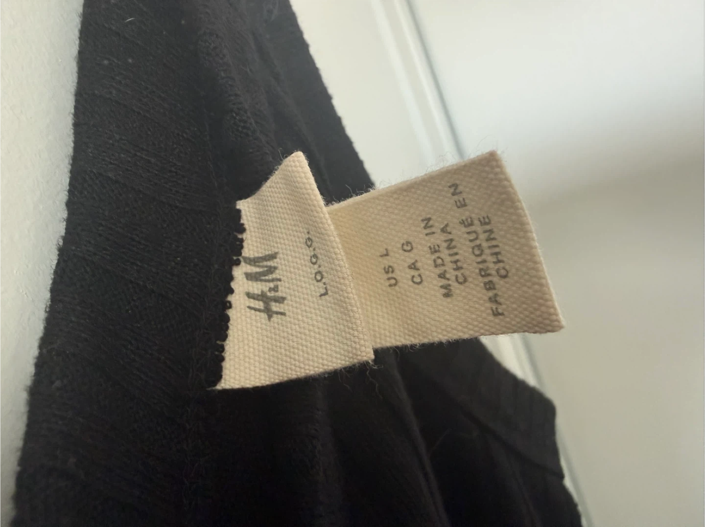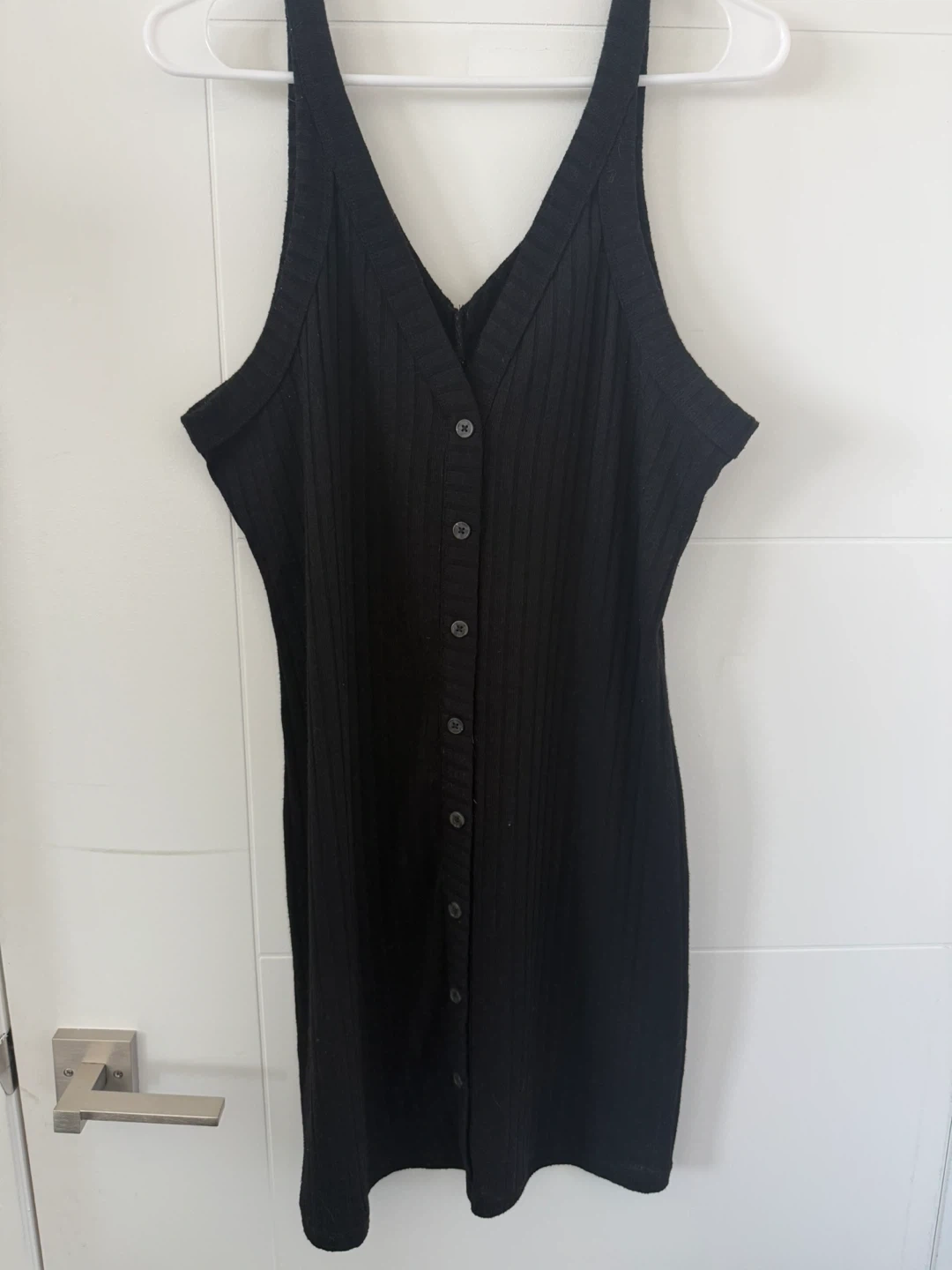This is a black ribbed mini dress from H&M. It features a V-neckline with button-up detailing. Made in China. Size L.