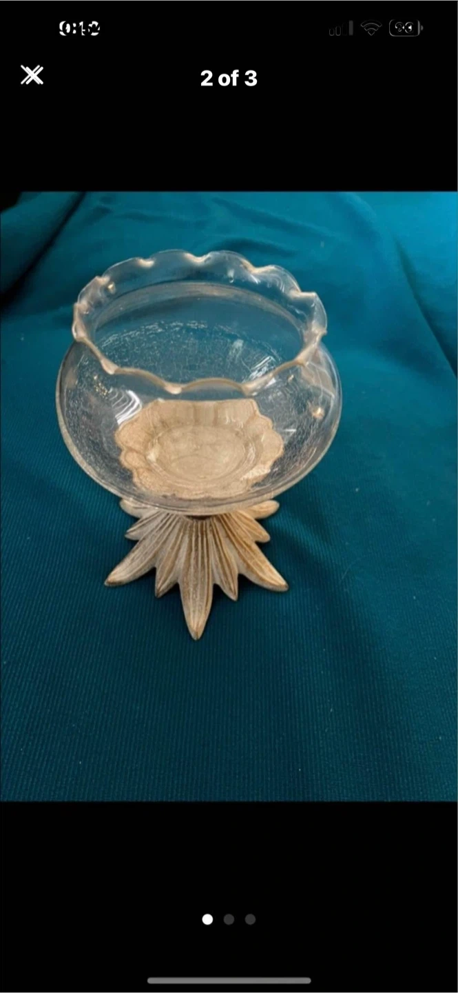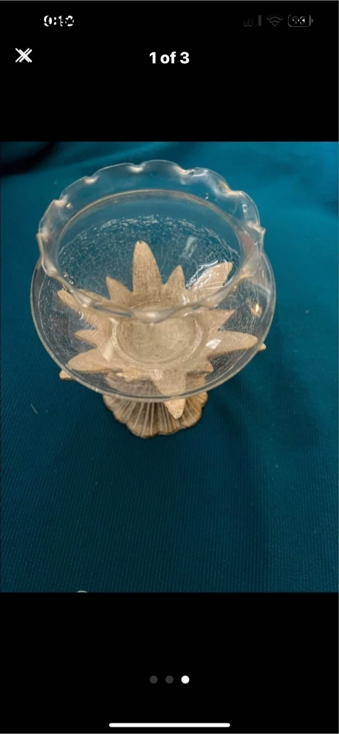This is a decorative glass candy dish with a unique ornate base. The glass bowl has a ruffled edge and the base resembles a starburst or flower design. It's perfect for holding small treats or as a decorative accent piece.