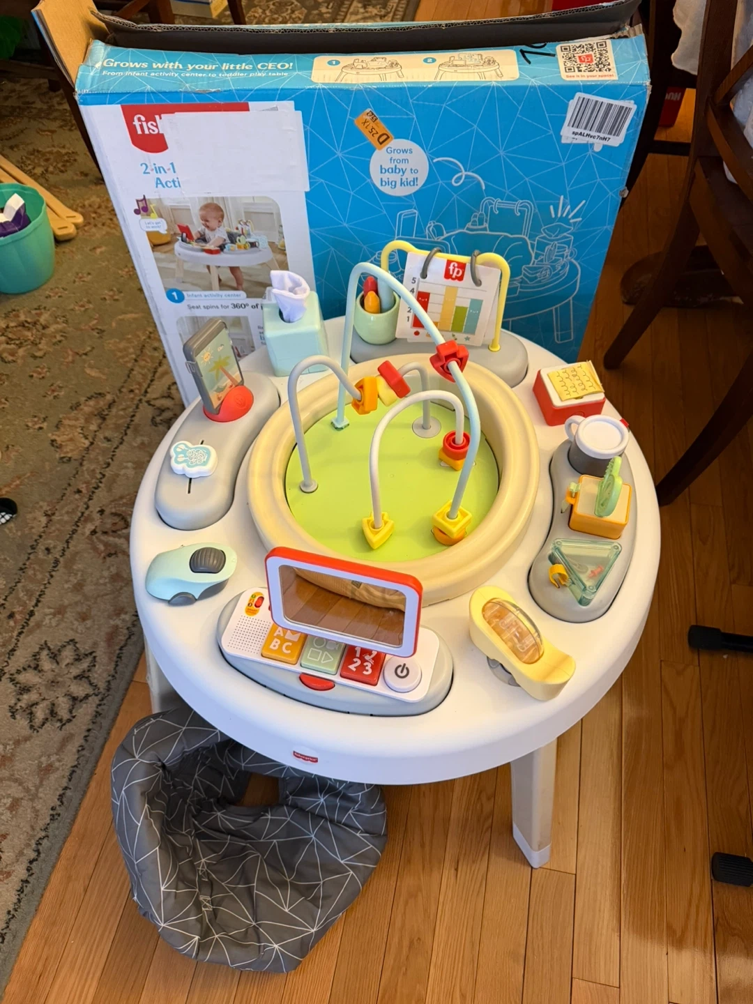 Excellent condition activity center. We only used it for a few times. Comes with the original box and everything is complete and good as new.