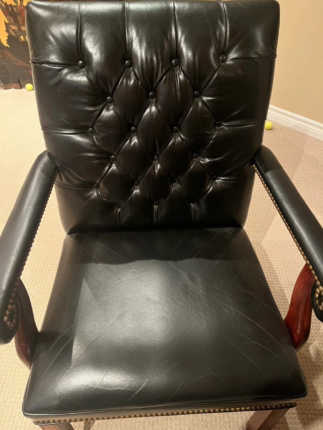 This is a comfortable black leather executive office chair. It features a tufted back and studded armrests. Great for a home office or study!