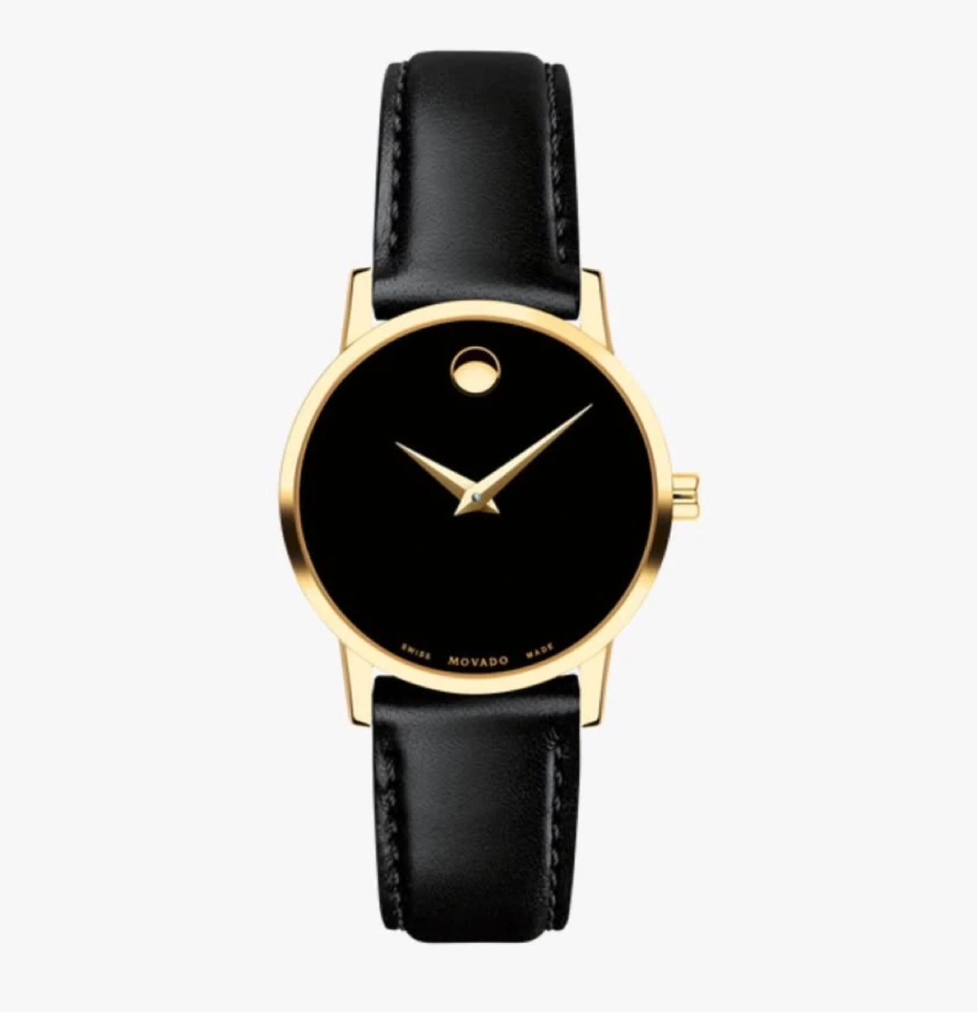 Movado Museum watch, Movado Museum Classic, women’s luxury watch, minimalist watch design, black dial gold dot, gold tone watch, Swiss quartz watch, designer watch, modern classic watch, leather strap watch, iconic watch design, MoMA watch design, elegant women’s watch, luxury timepiec