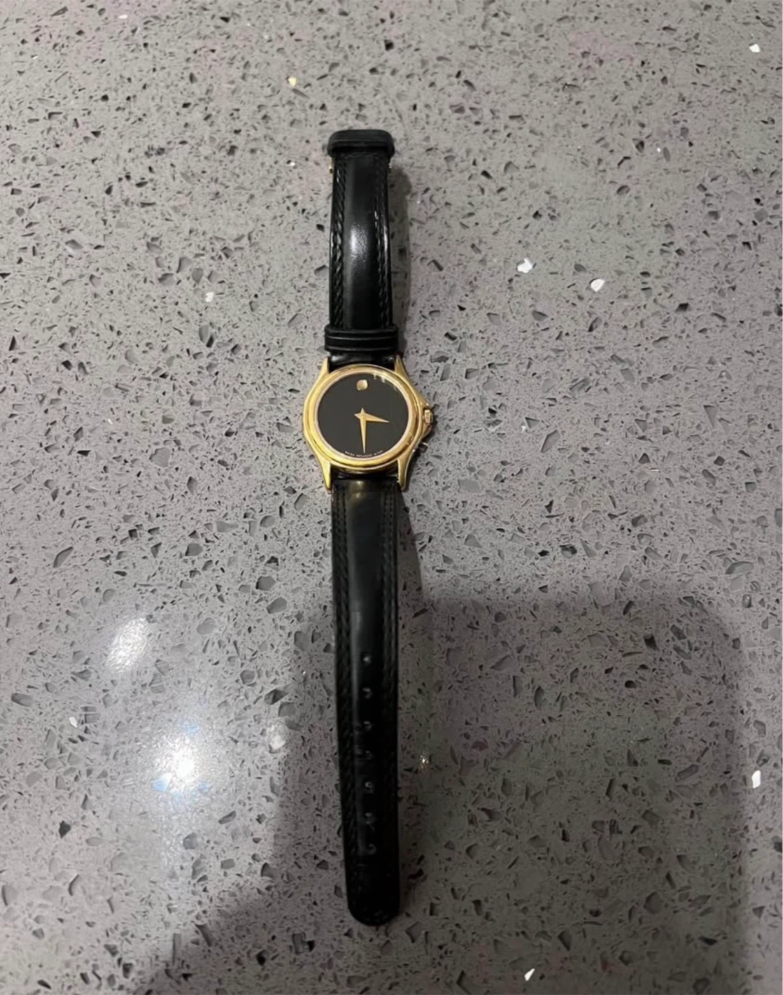 Timeless Movado Museum Classic women’s watch featuring the iconic minimalist black dial with signature single gold dot at 12 o’clock. Gold-tone case paired with a sleek black leather strap for a refined, understated look.
