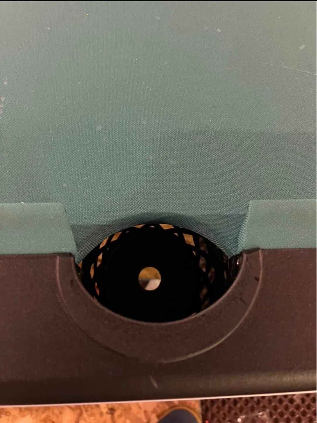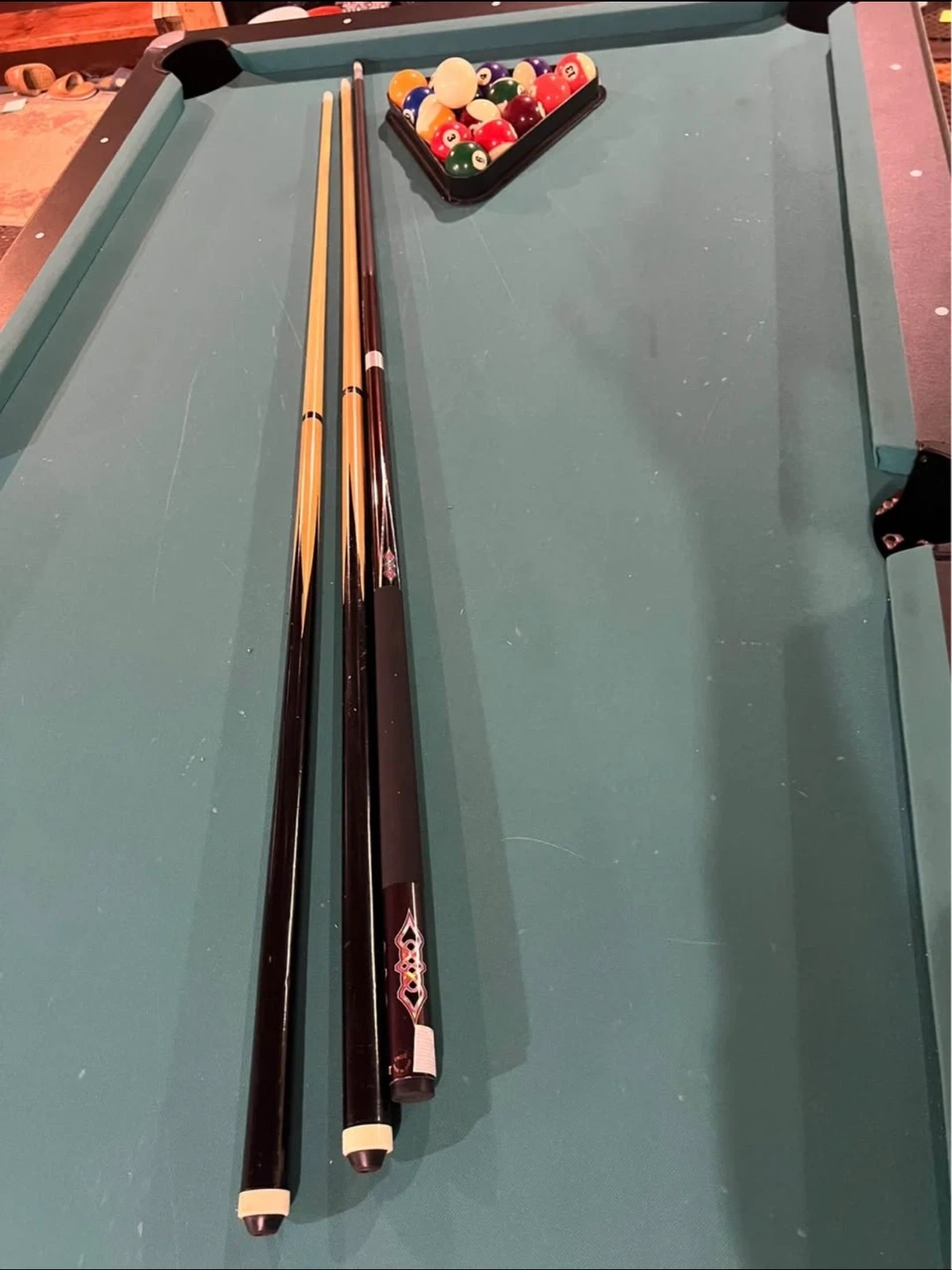 This is a pool table with a green felt surface. It comes with three cues and a set of pool balls. The table has black rails and pockets. It's ready for a game night!