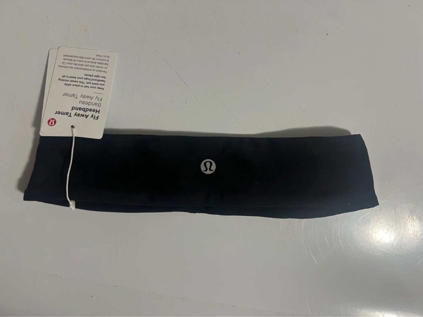 This Lululemon Fly Away Tamer headband is black. It's designed to keep your hair in place during workouts. The sweat-wicking material hugs your head well.