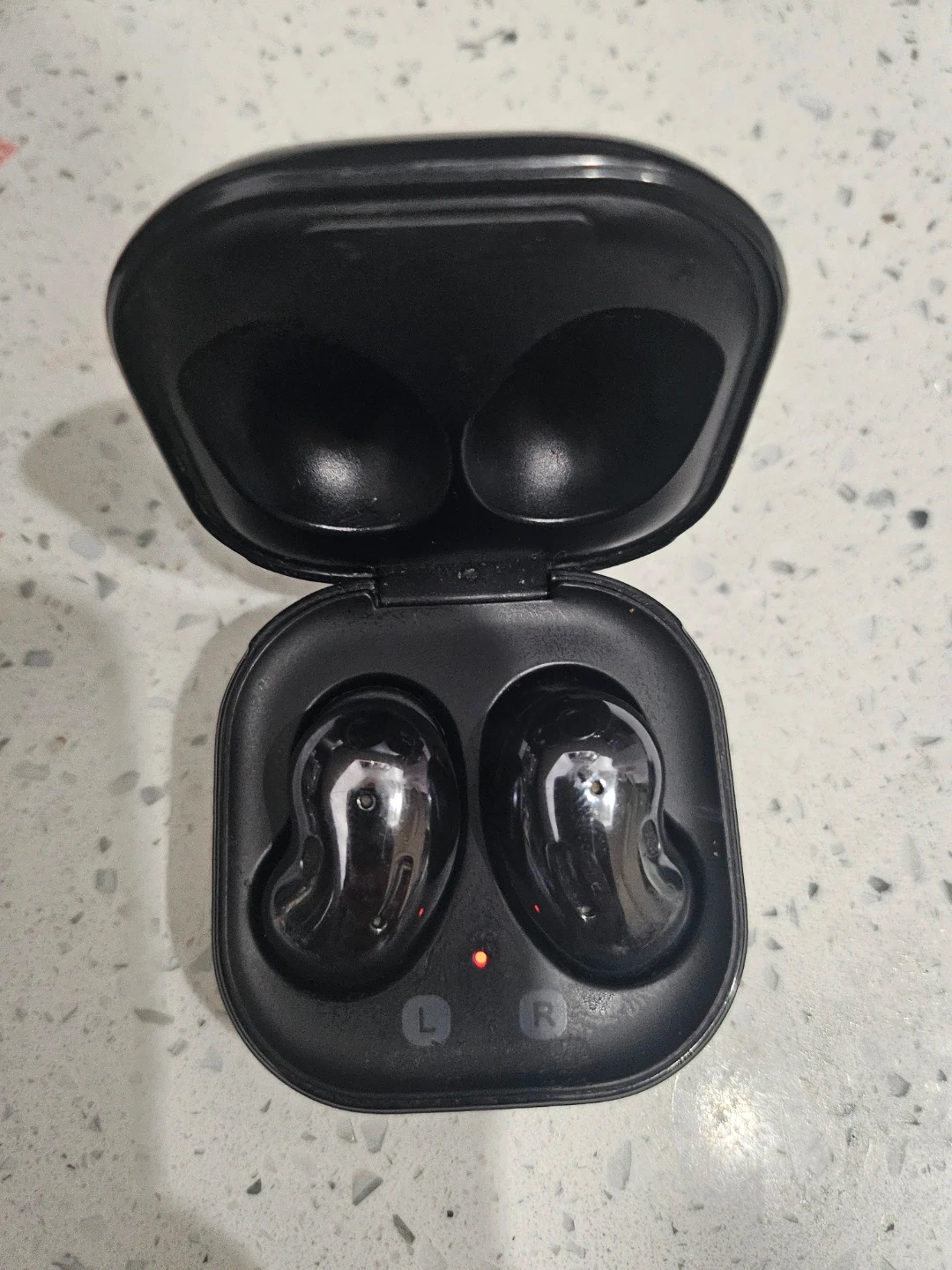 Black Samsung Galaxy Buds Pro wireless earbuds with charging case. Includes left and right earbuds.