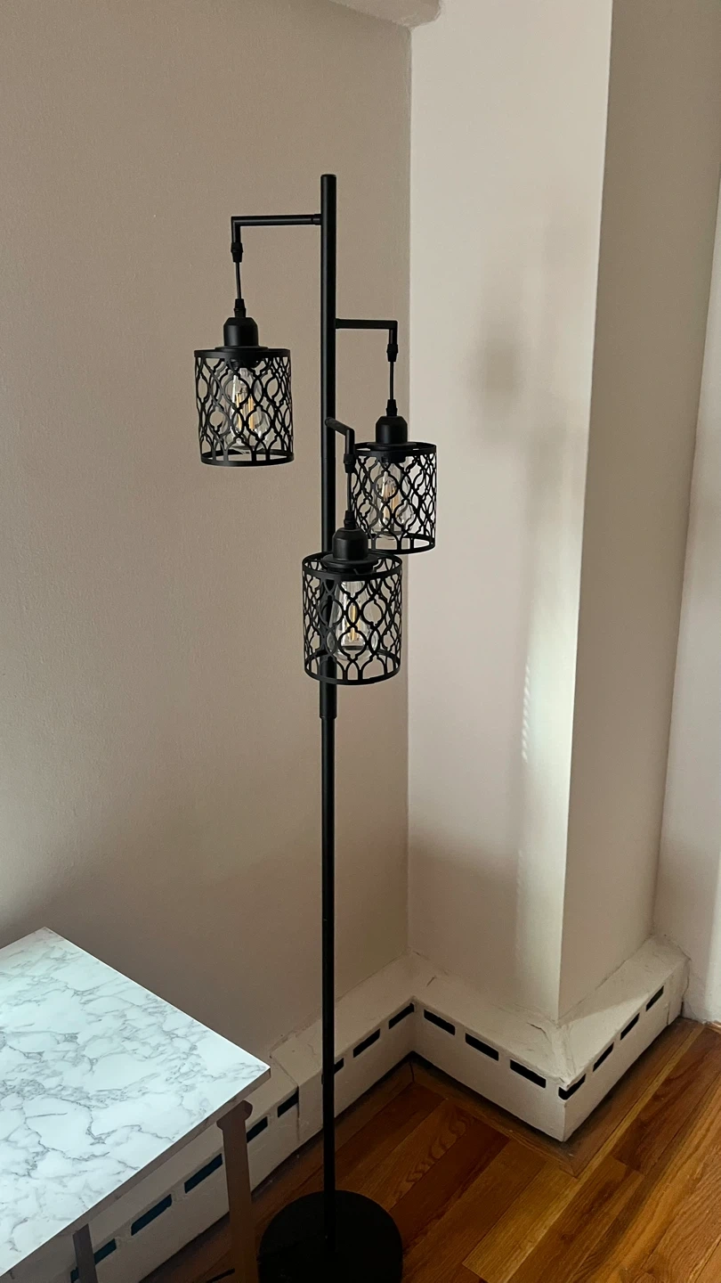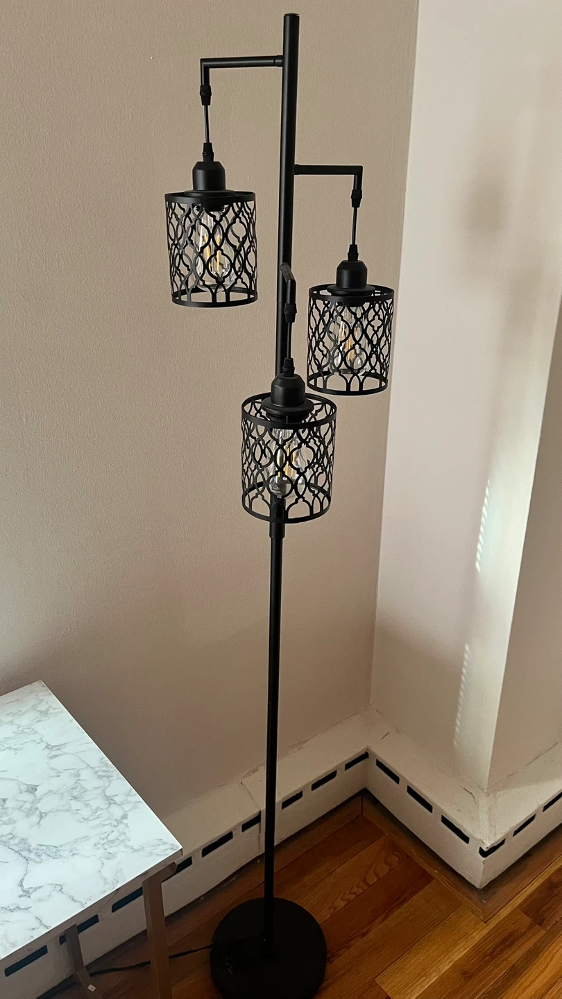 This black floor lamp features three adjustable light fixtures, each with a decorative metal cage shade. Its slender design makes it easy to place in various rooms. Provides ambient lighting.