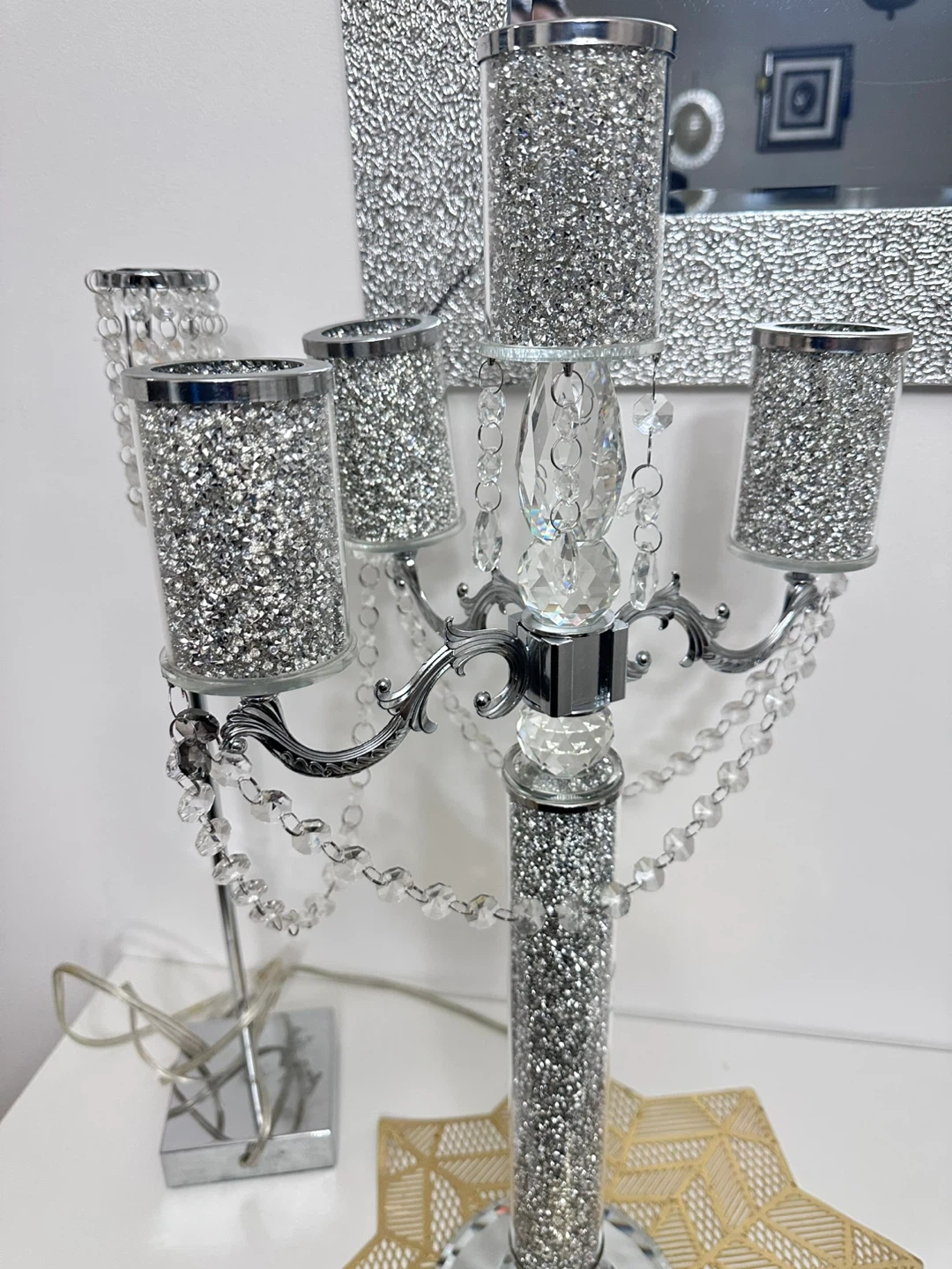 This sparkly candelabra features a silver-toned metal frame adorned with clear crystals and crushed mirror accents. It has five arms for candles and hangs with beaded crystal chains. Comes with a matching small crystal accent lamp with a square base. It's a dazzling set for adding glamour!