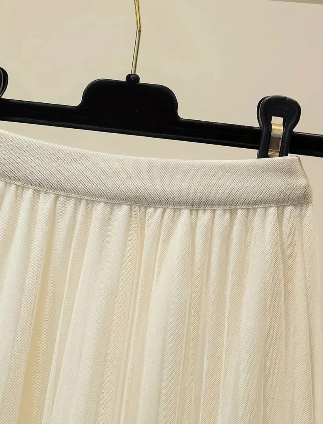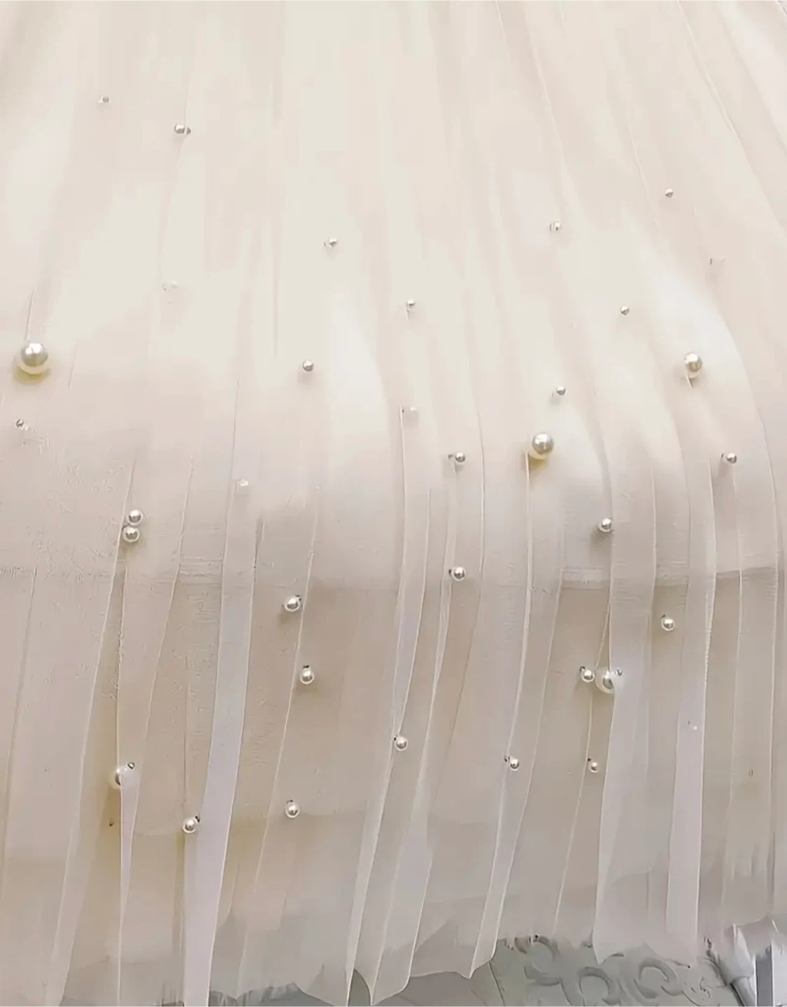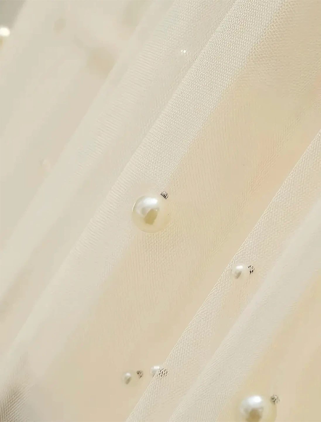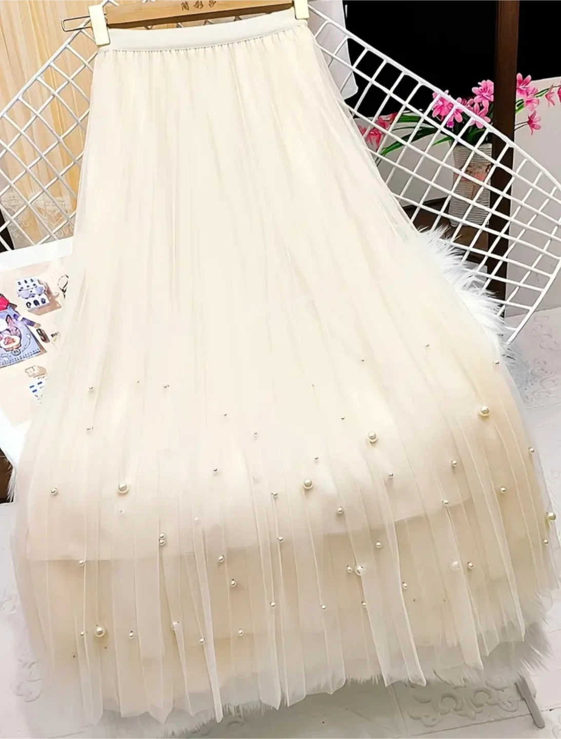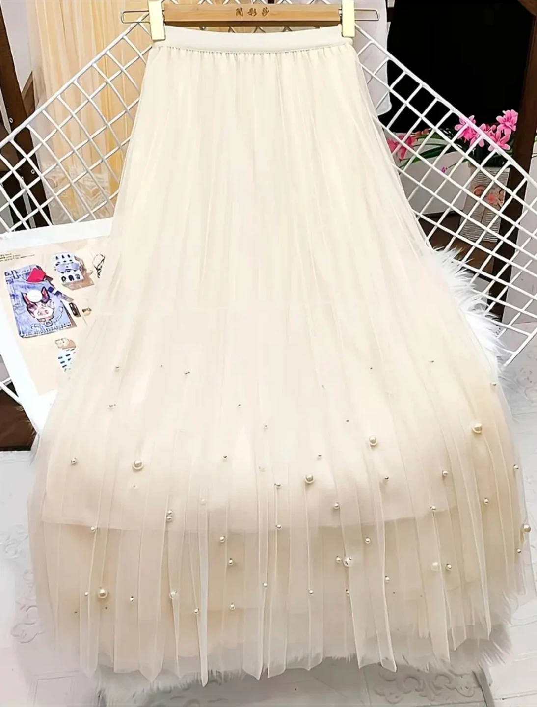 This elegant off-white tulle skirt features scattered pearl embellishments throughout its flowing layers. It has a comfortable elastic waistband and a delicate, airy feel. Perfect for adding a touch of sophistication to any outfit!