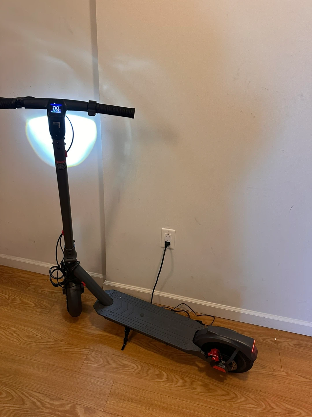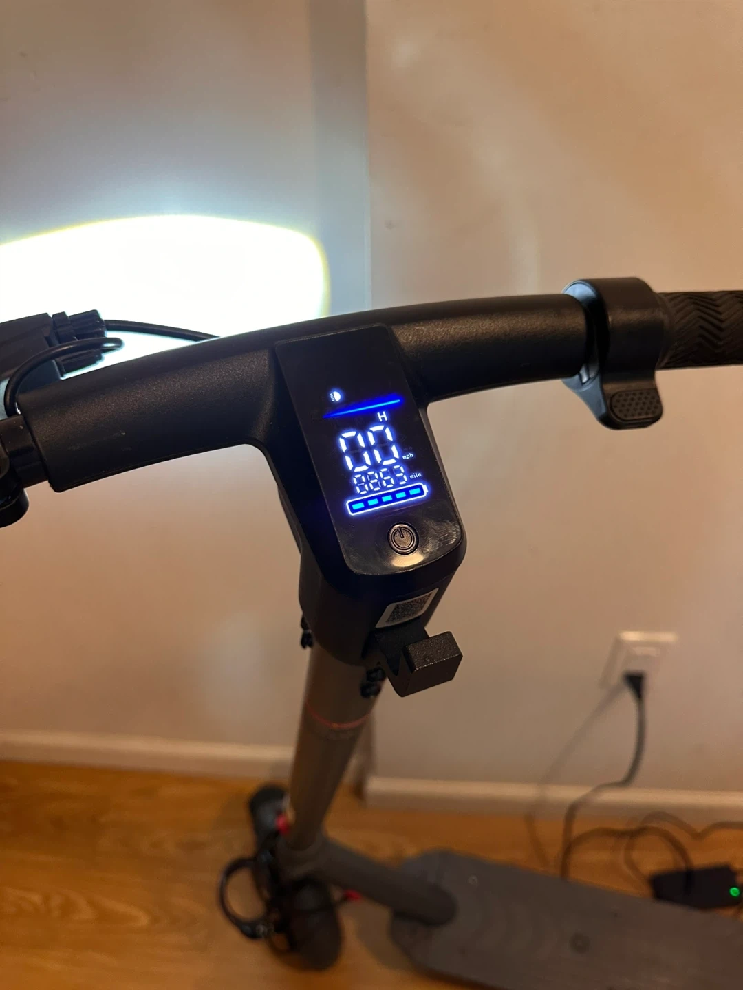 This electric scooter has a digital display showing speed and battery life. Comes with the charger.