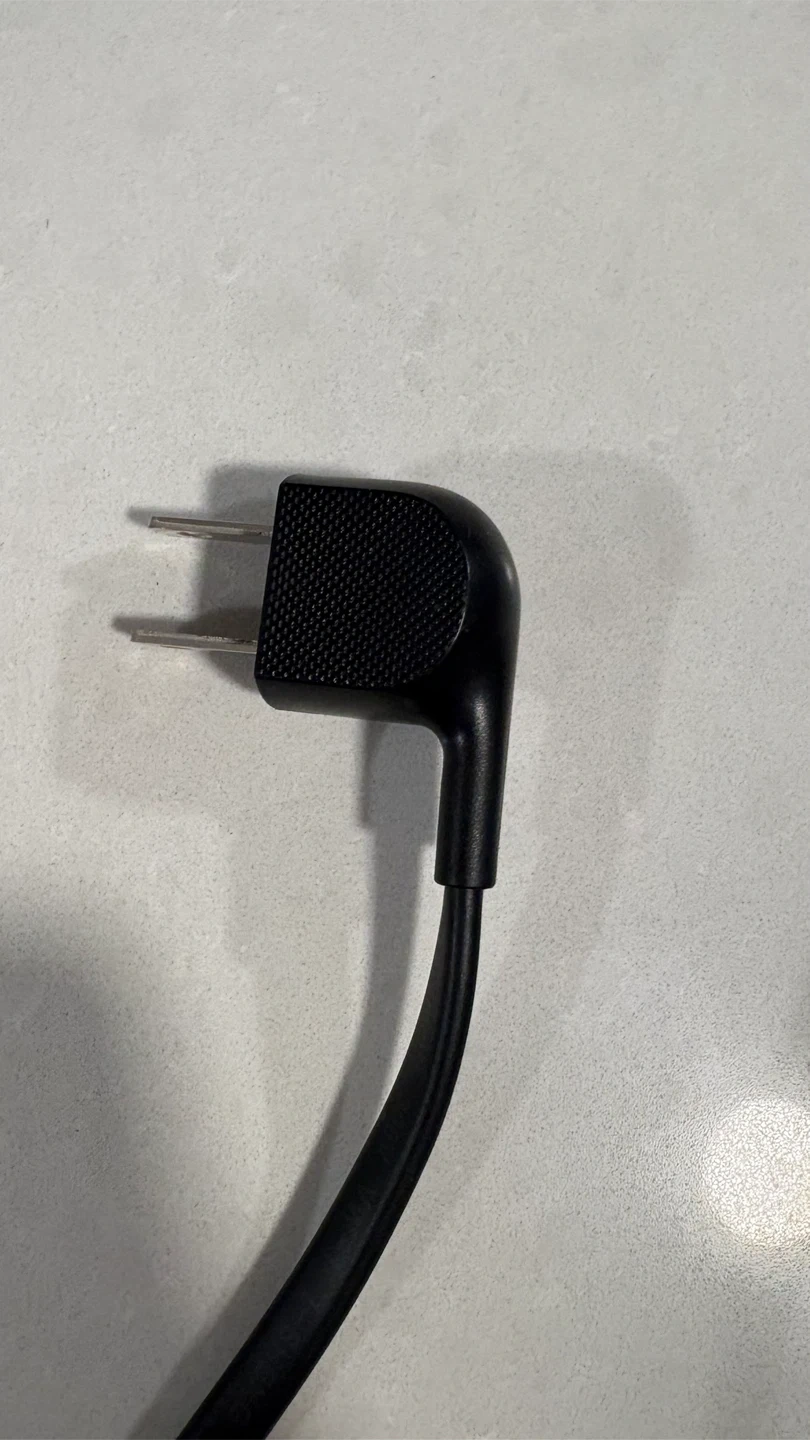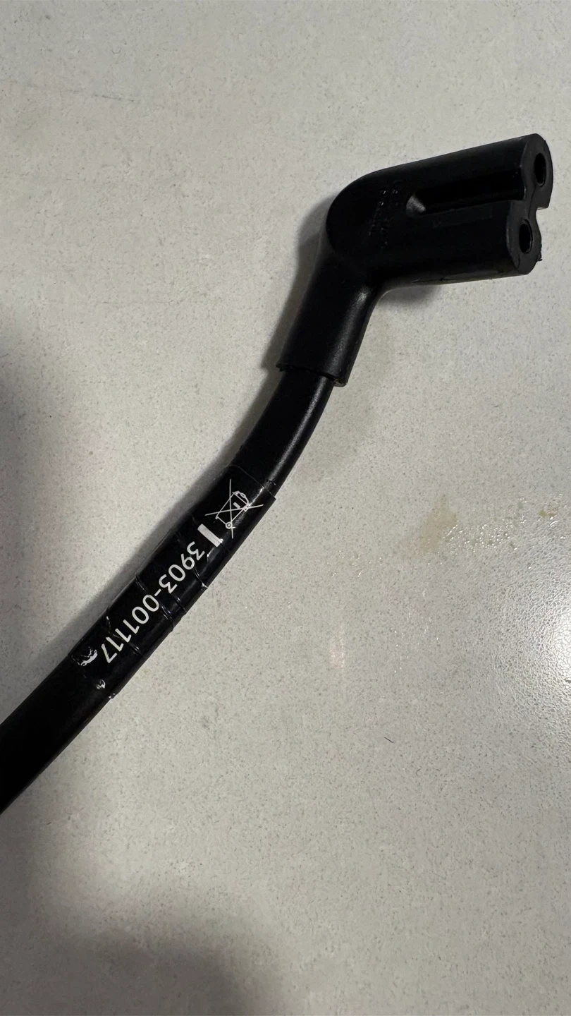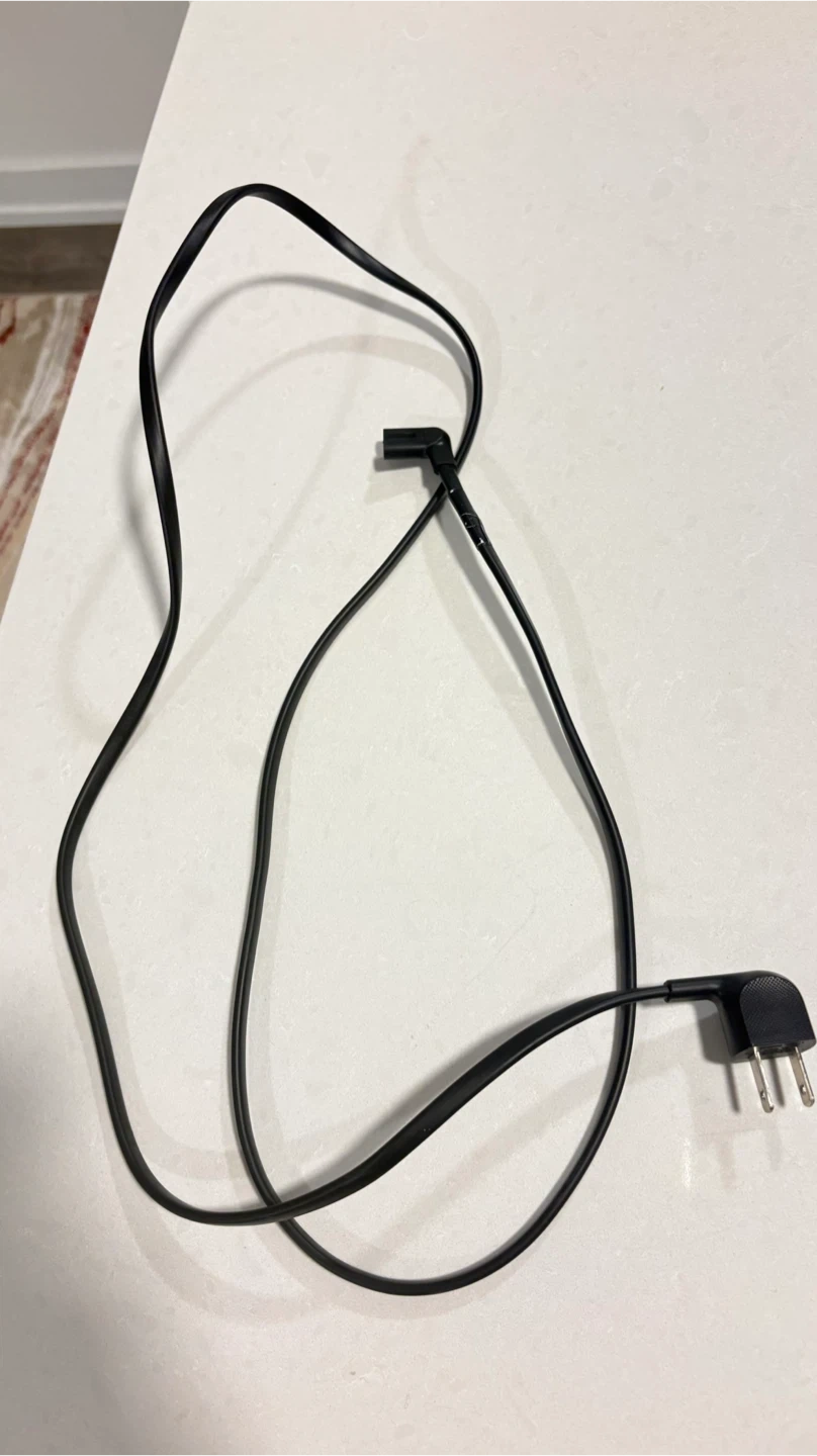 This is a black power cord cable. It has a standard North American plug on one end and a two-pin connector on the other. It's about 6 feet long.