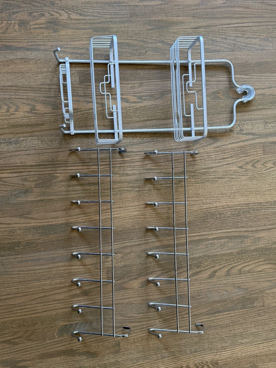 Silver tone metal shower caddy with two hanging baskets for storage. It comes with two detachable shelves that hook onto the main unit. Ideal for organizing toiletries in the shower!