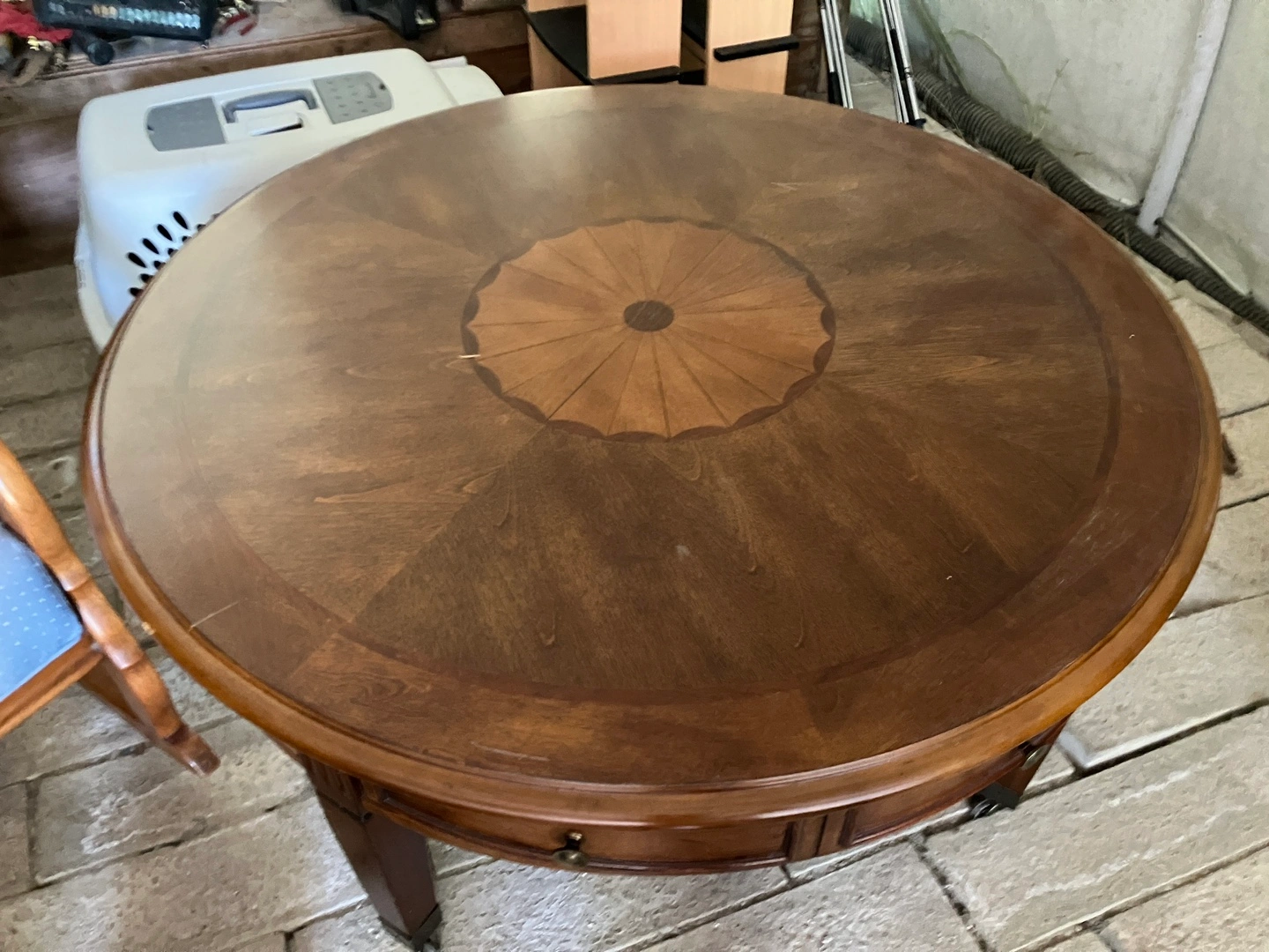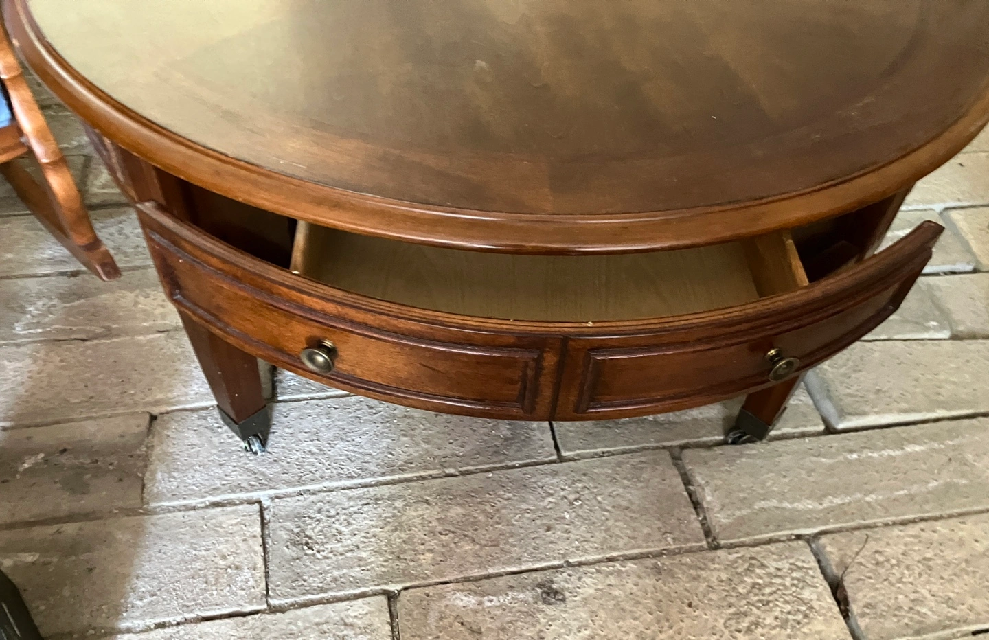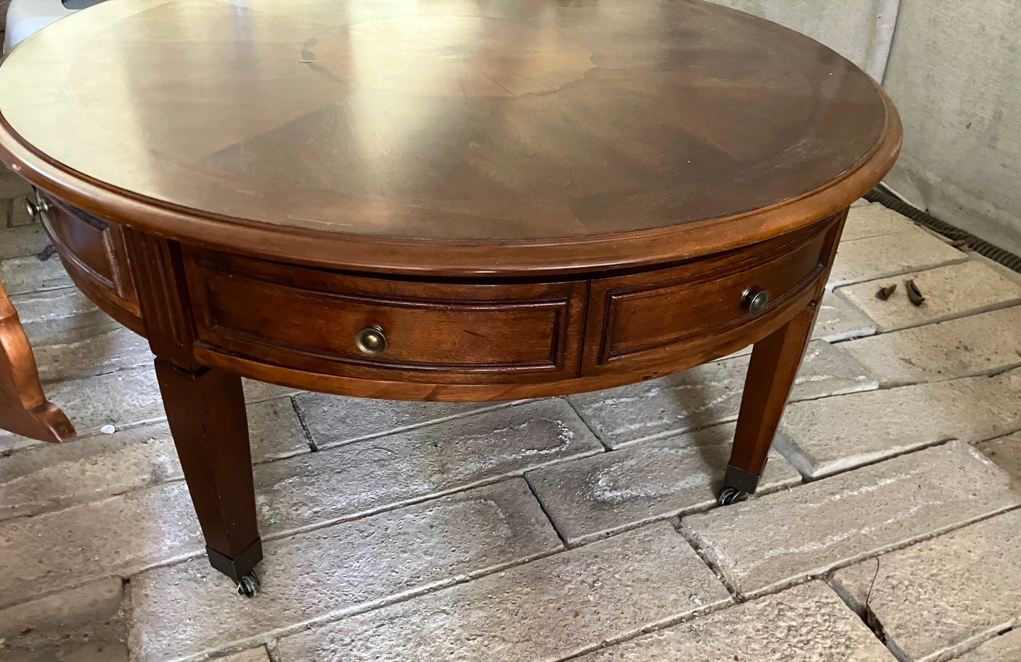 lovely round coffee table made of mottled mahogany has a sun burst centre design on top and features drawers for extra storage. 4 brass capped legs on casters in good condition and would be a great addition to any living room