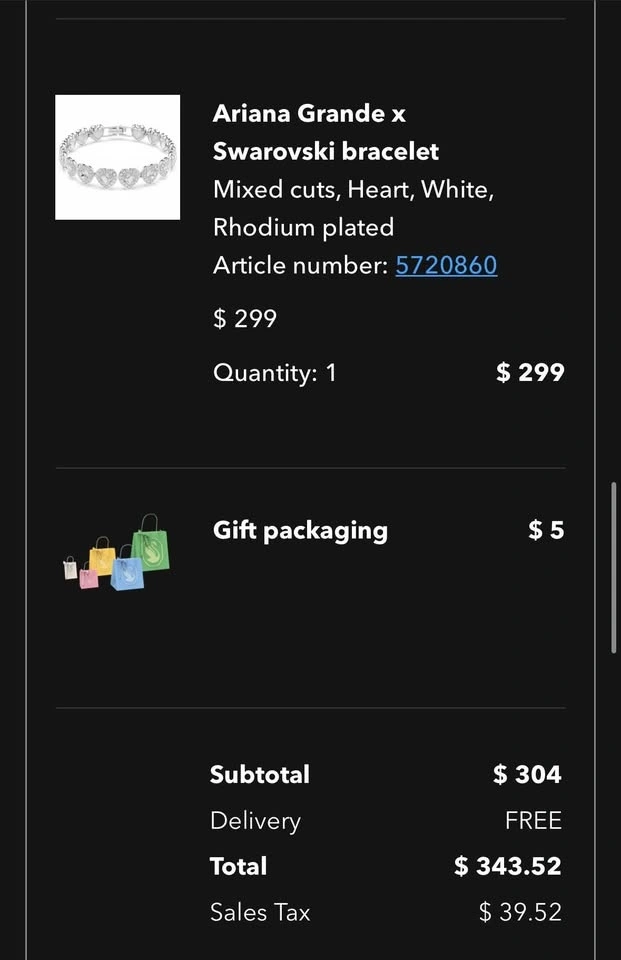 Brand new, never worn. Paid $343 (with tax), asking $300. Includes original Swarovski packaging. Elegant crystal tennis bracelet from the Ariana Grande x Swarovski collaboration — perfect for everyday luxury or special occasions. Amazing shine and quality, makes a great gift. Meet-up in Scarborough. Cash payment only.