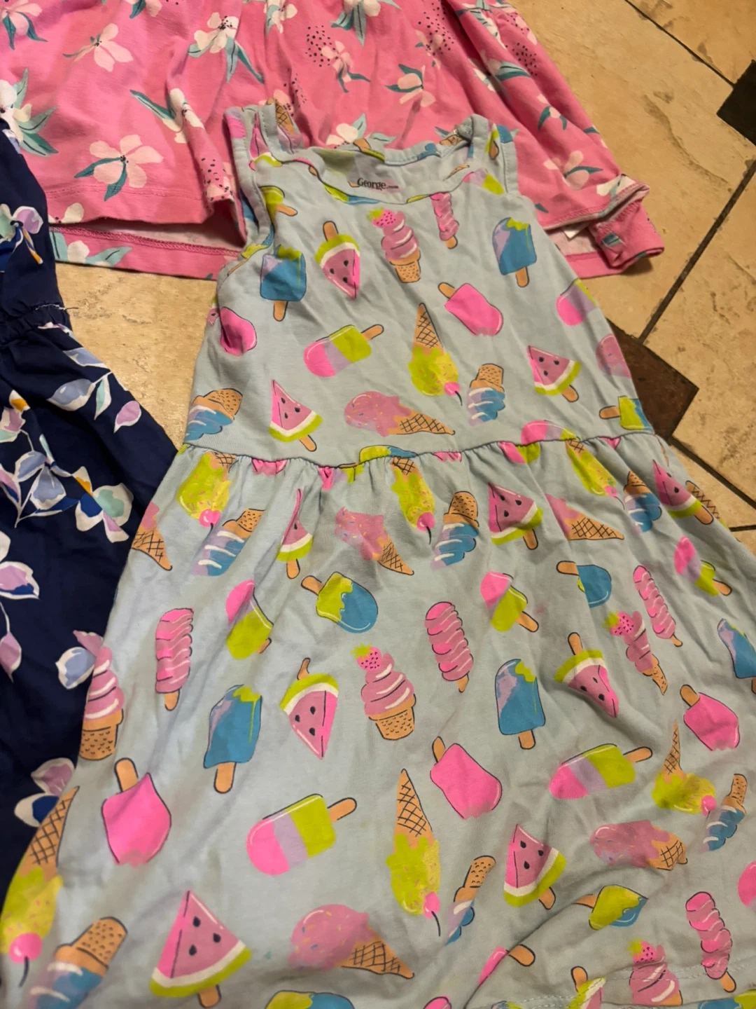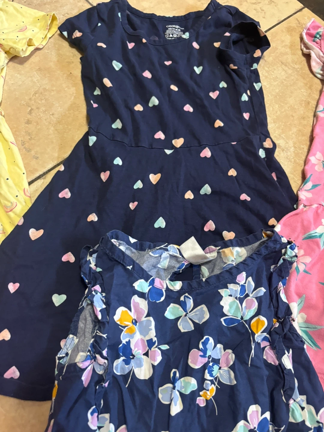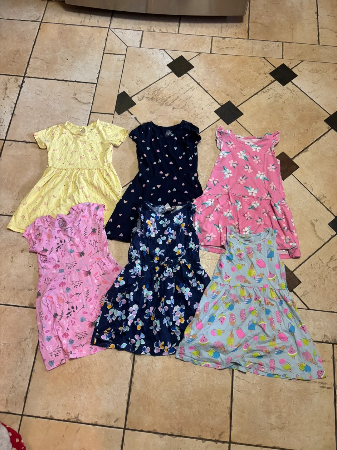 Six cute little dresses for a girl. Includes various patterns like hearts, flowers, rainbows, and ice cream treats. Perfect for warm weather fun!