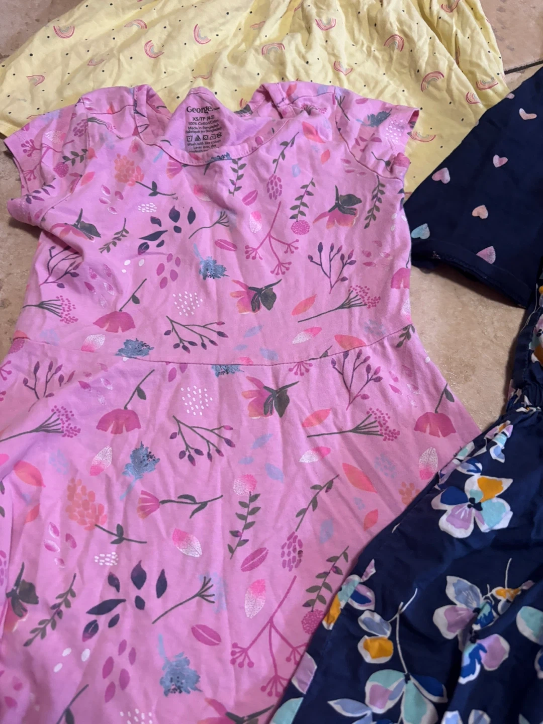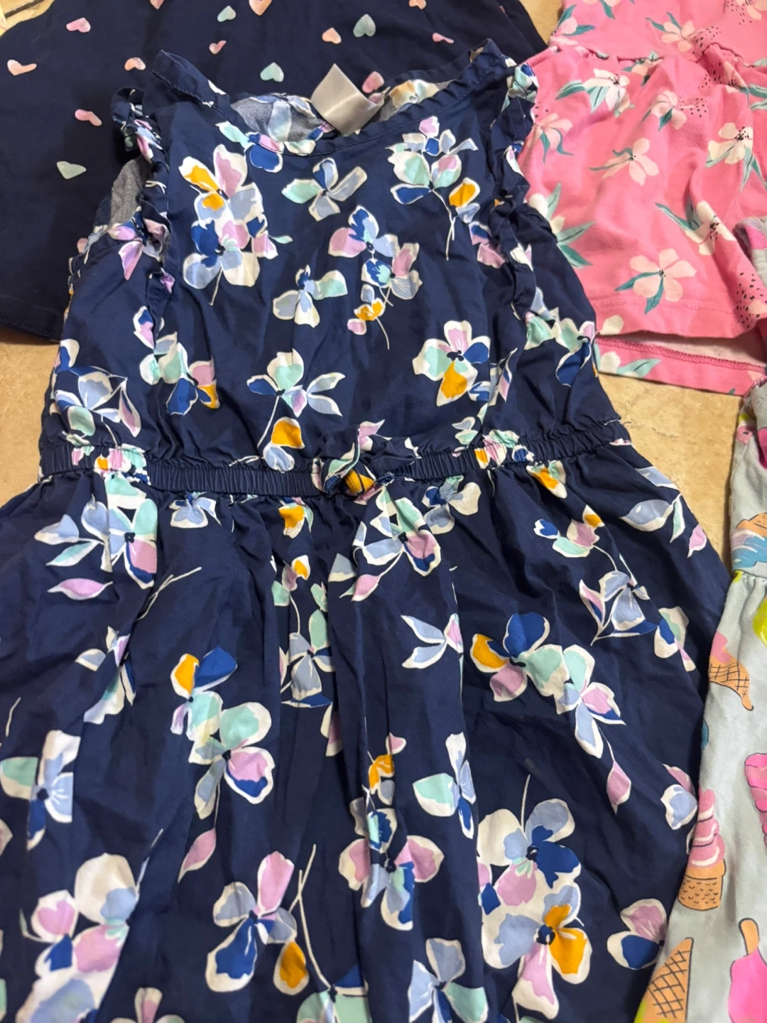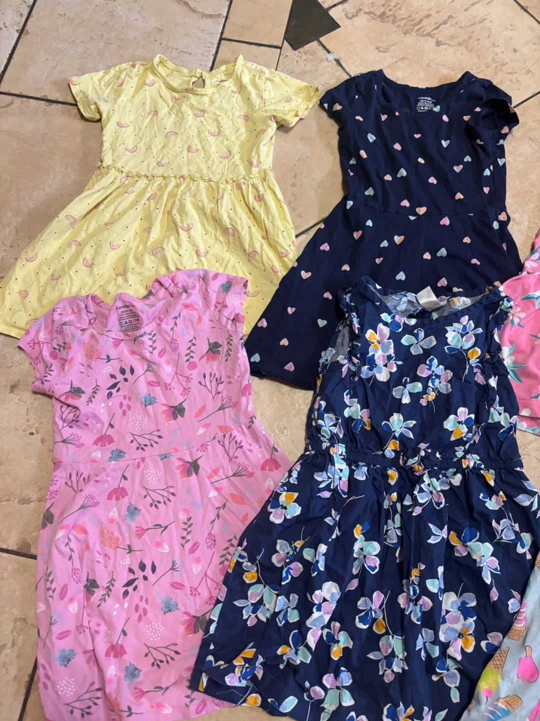 Six cute little dresses for a girl. Includes various patterns like hearts, flowers, rainbows, and ice cream treats. Perfect for warm weather fun!