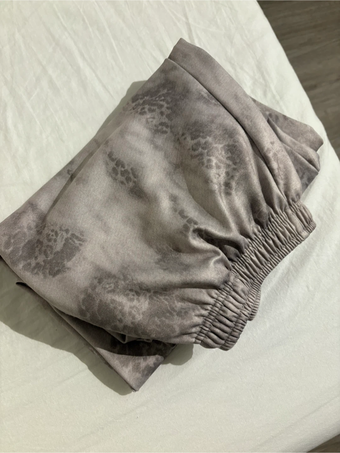 Selling a pair of sweatpants in size L. They have a unique grey patterned design and are in great condition! Perfect for lounging or casual wear, these pants are both stylish and comfortable