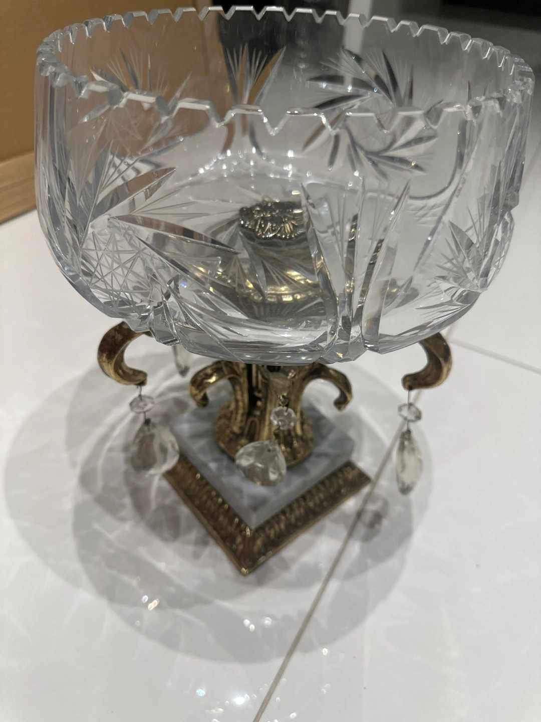 Beautiful crystal bowl, etched detailing. Gold-tone metal stand, marble base. Hanging crystal accents. Unique centerpiece or decorative accent.