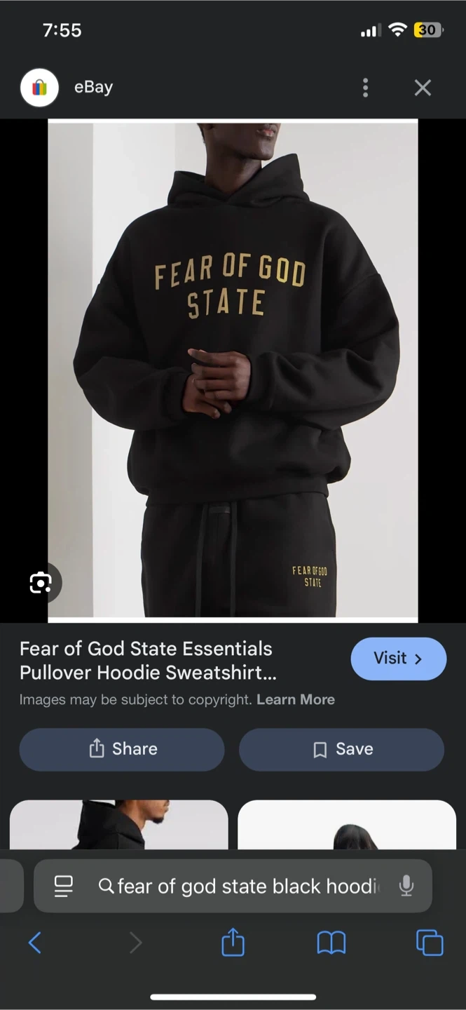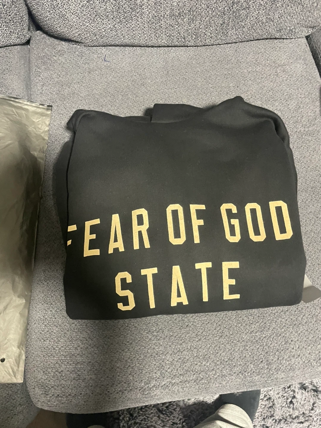 40Selling a Fear of God Essentials pullover hoodie in black. It's a size small. The hoodie features the "FEAR OF GOD STATE" print. Originally bought for $120