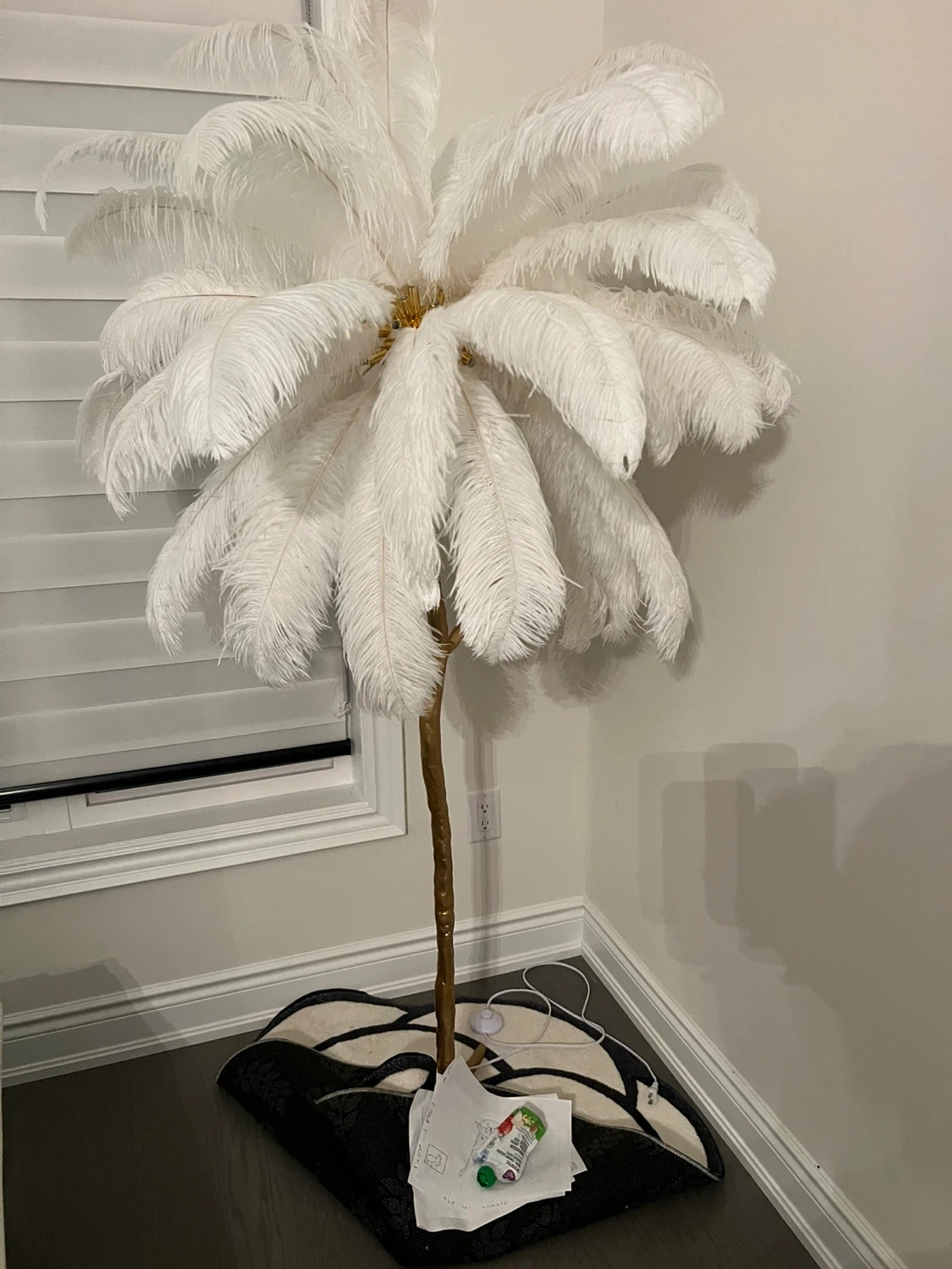 Looking to add a touch of elegance to your space? This feather palm tree floor lamp is a real statement piece! It's in great condition and ready to brighten up any room. The white feathers and gold-tone trunk make it a stylish addition to your home decor