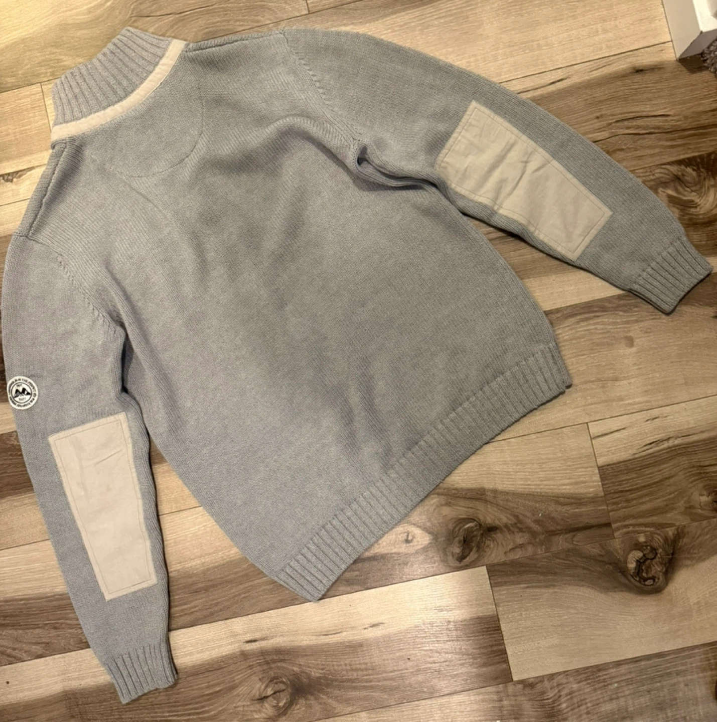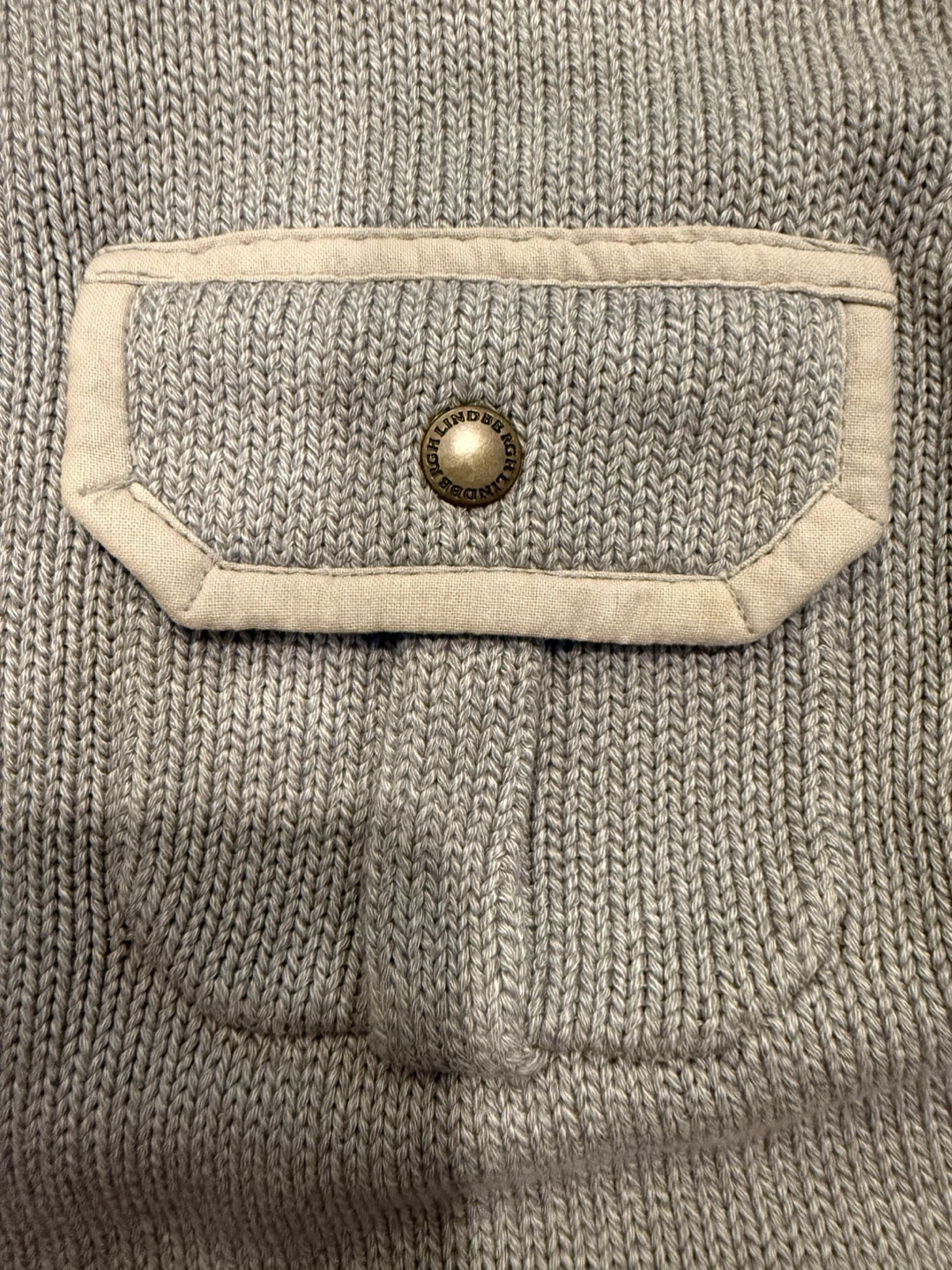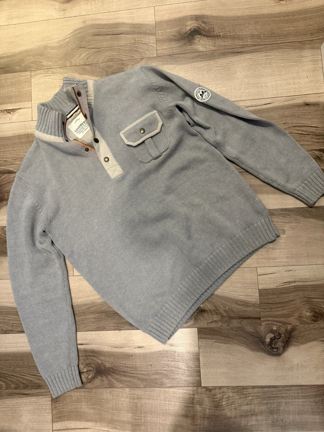 This Lindbergh quality sweater is a great addition to any wardrobe. It's made of a thick knit material and features a quarter-zip neckline with snap button closure. There's a chest pocket with button closure and elbow patches for added detail. Perfect for cooler weather!