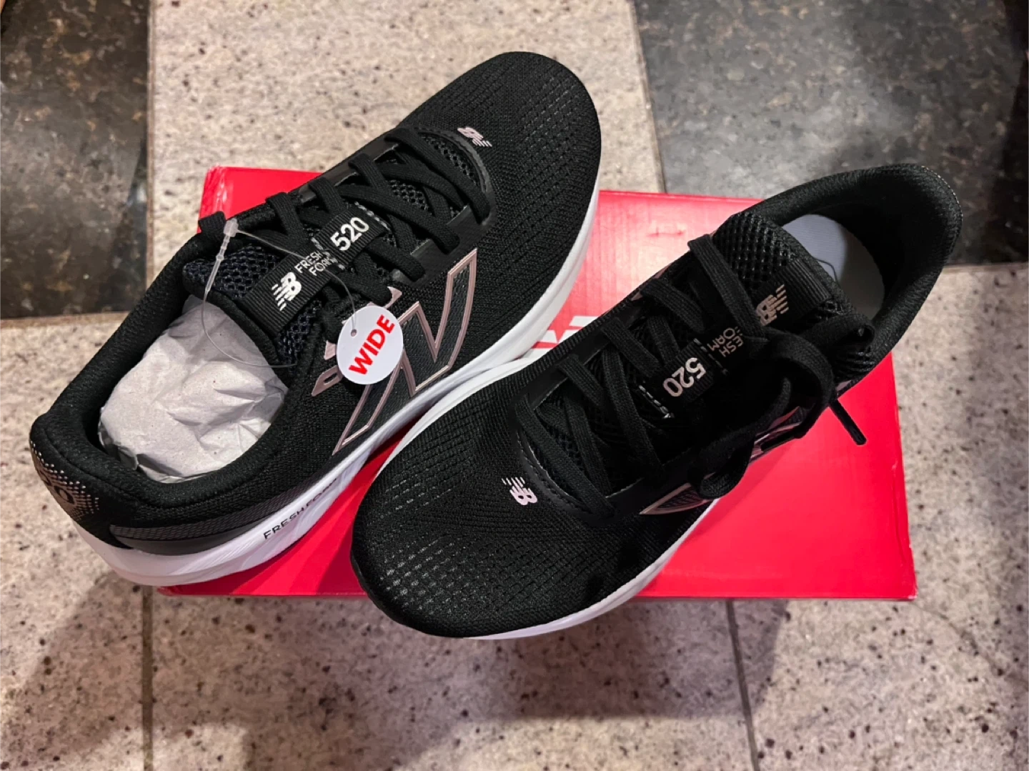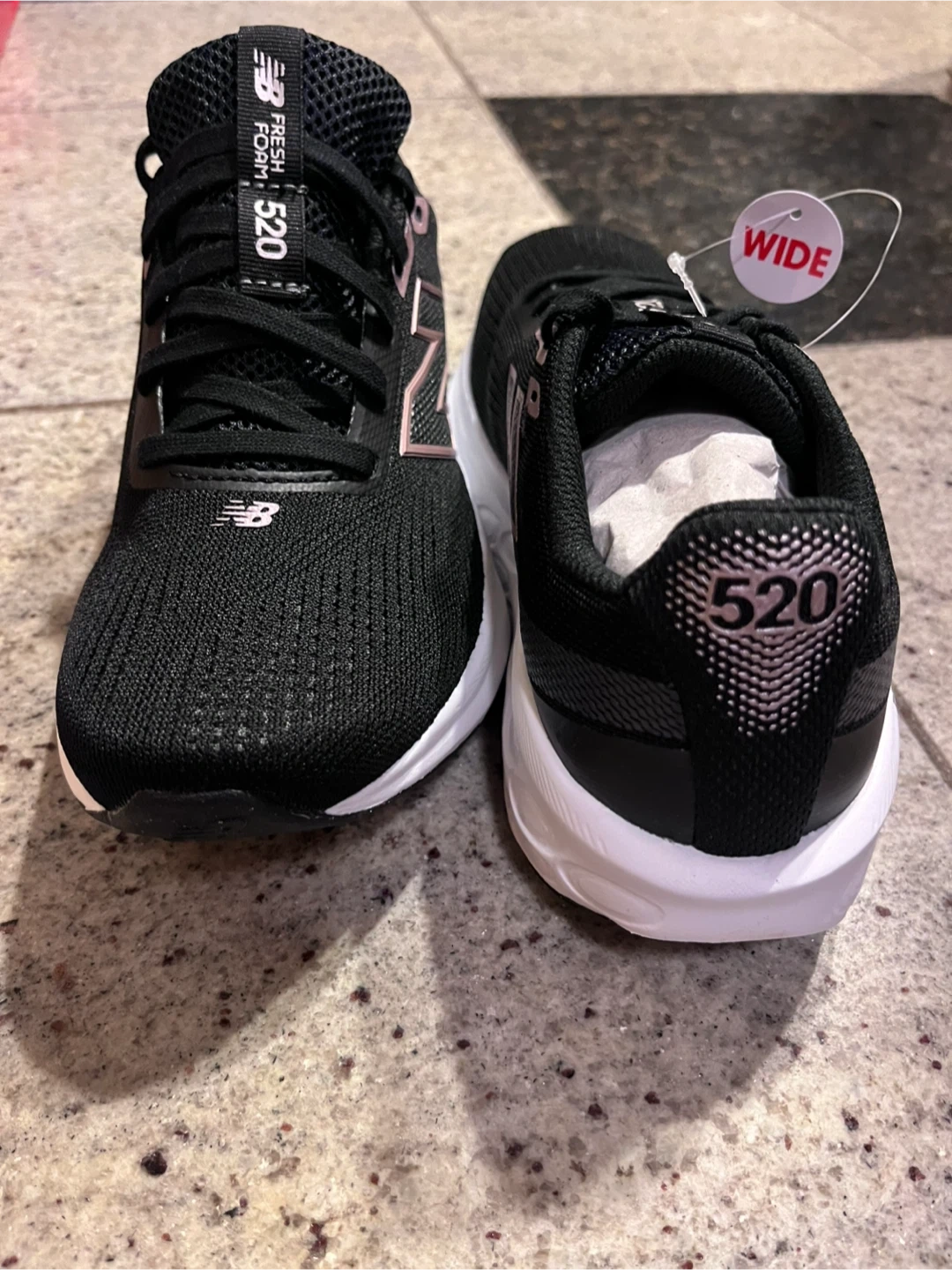 I'm selling a pair of brand new New Balance Fresh Foam 520 v9 Wide sneakers in black grey. They come in the original box. Women’s size 6.5 wide.