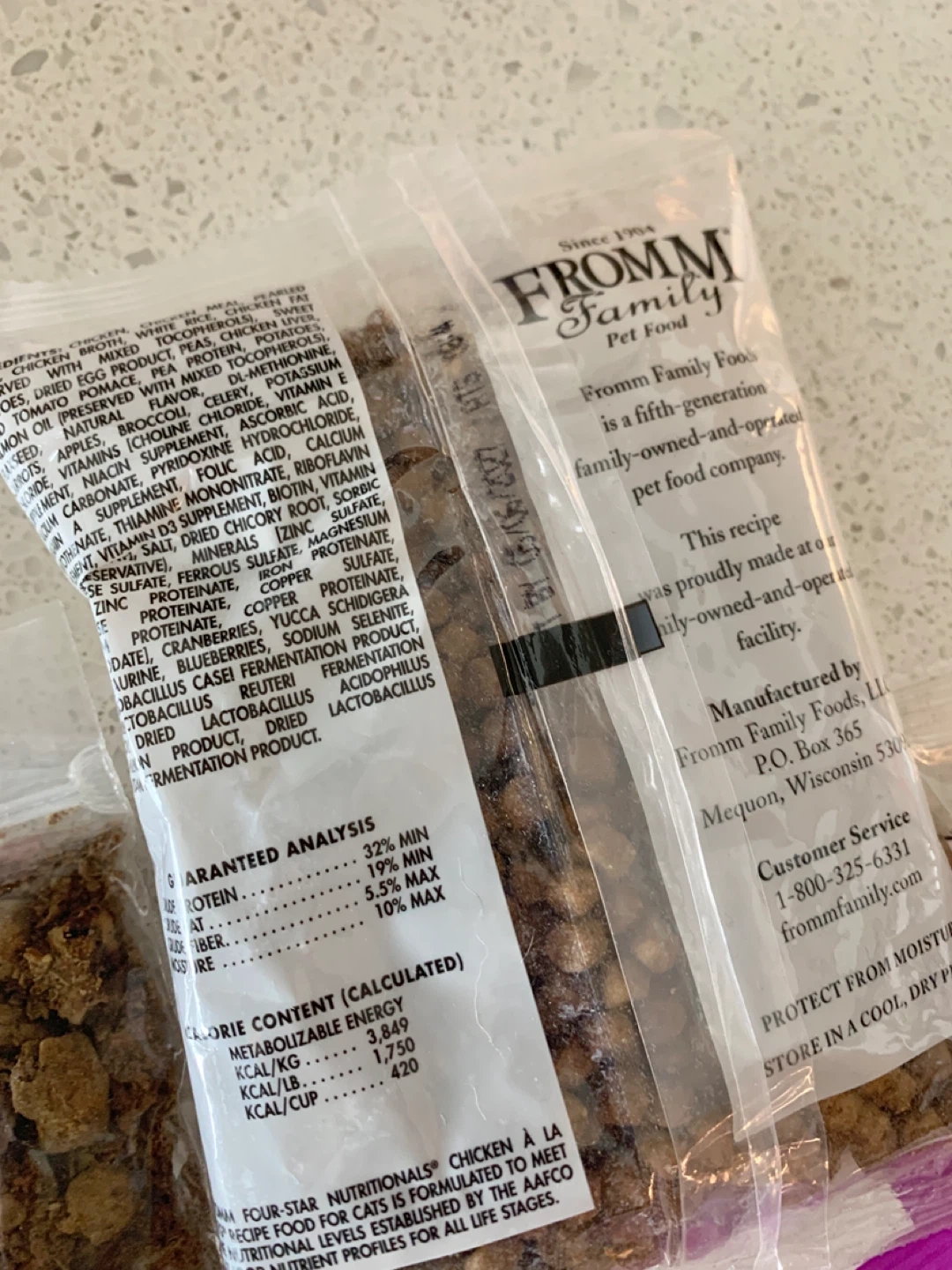 This is a variety pack of premium cat food. It includes Tiki Cat Born Carnivore High Protein Dehydrated Chicken & Egg Recipe and Fromm Family Pet Foods in Chicken a la Veg and Game Bird recipes. Also included is a bag of Grand Cru by Pure Vita for cats. Nutritional information is available on packaging.