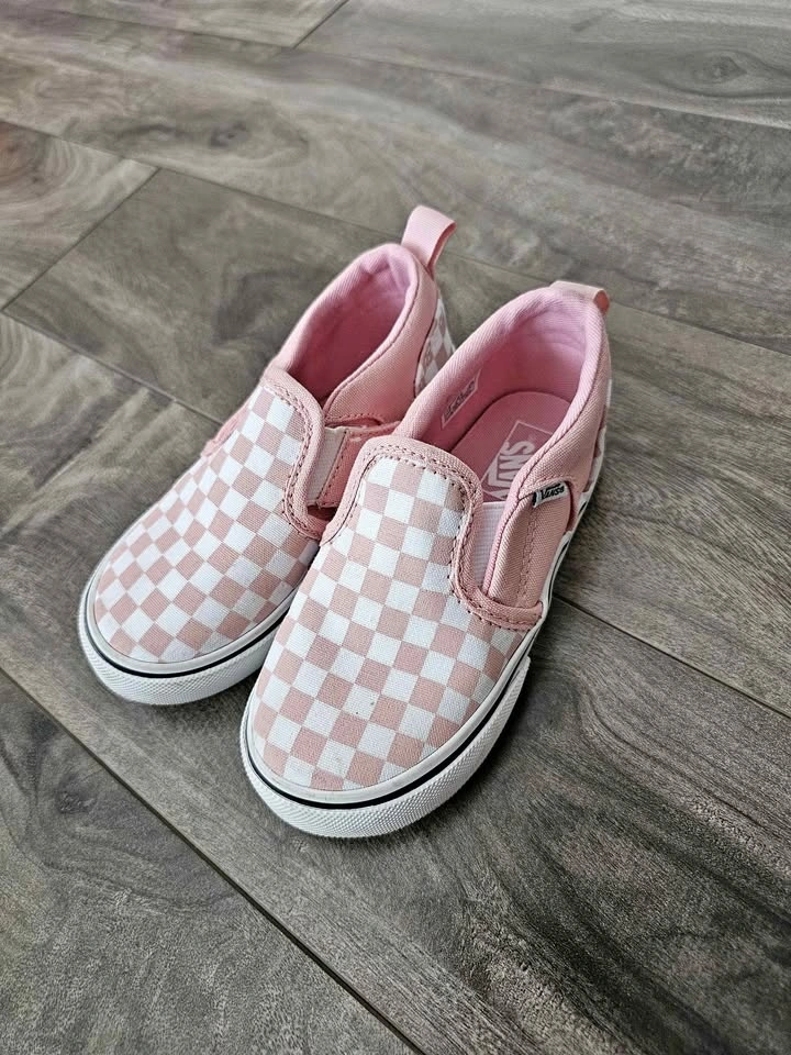 Cute Vans slip-on shoes with a pink and white checkered pattern. Easy to slide on and off. Soles are clean and have good tread.