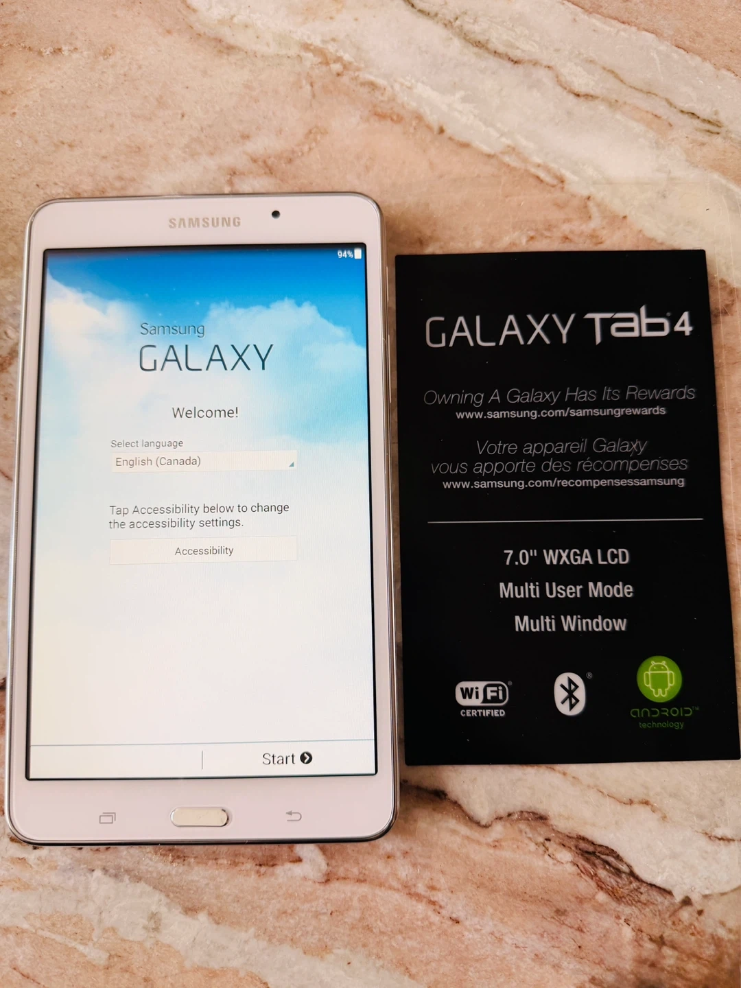 It comes with its original box in decent condition as seen in photos, Samsung charger & cord and a quick start guide. The tablet is powered by Android.