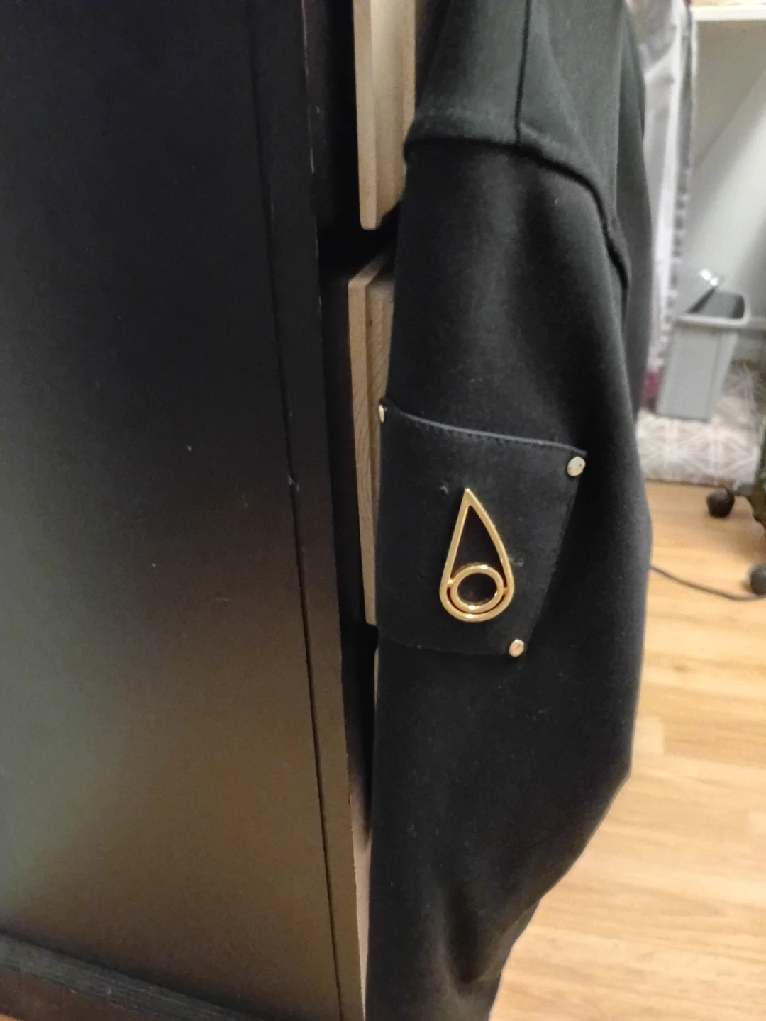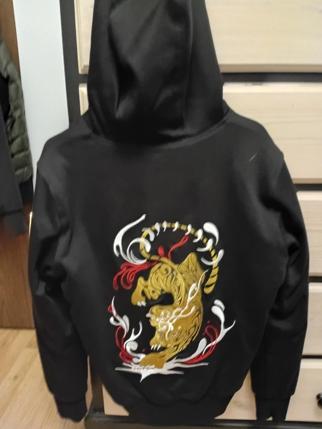 Selling a Moose Knuckles hoodie in black, size medium. It features a gold zipper and a cool tiger design on the back. Great for staying warm and stylish!