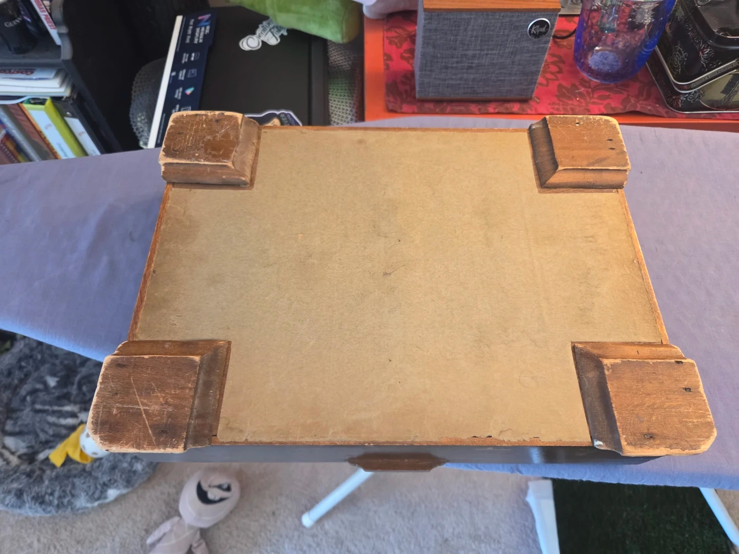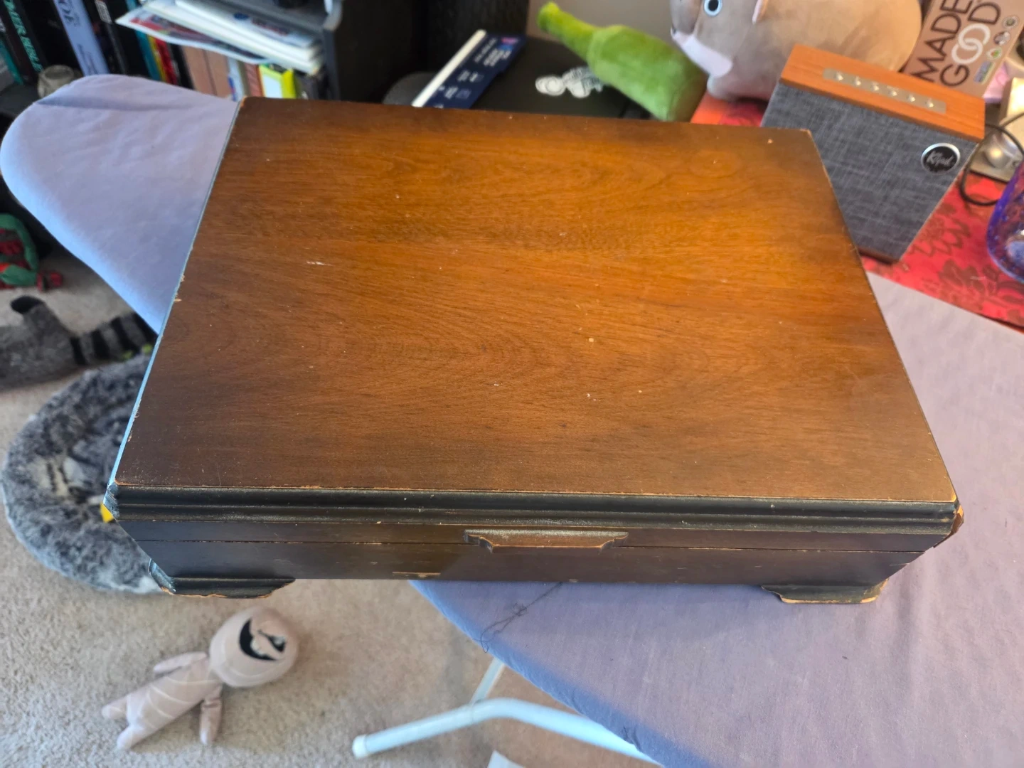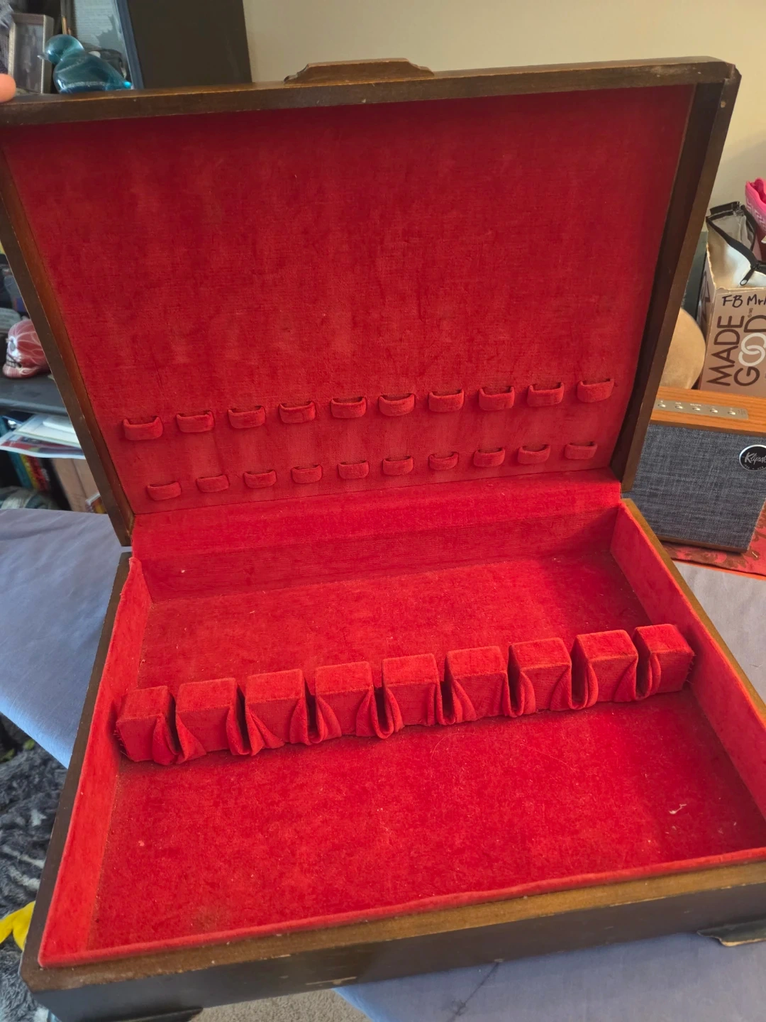 This is a vintage wooden box lined with red velvet, designed for storing cutlery. It has slots to organize your silverware. It's a practical piece for keeping your dining essentials tidy. ~14.5 X 10.5 inches.