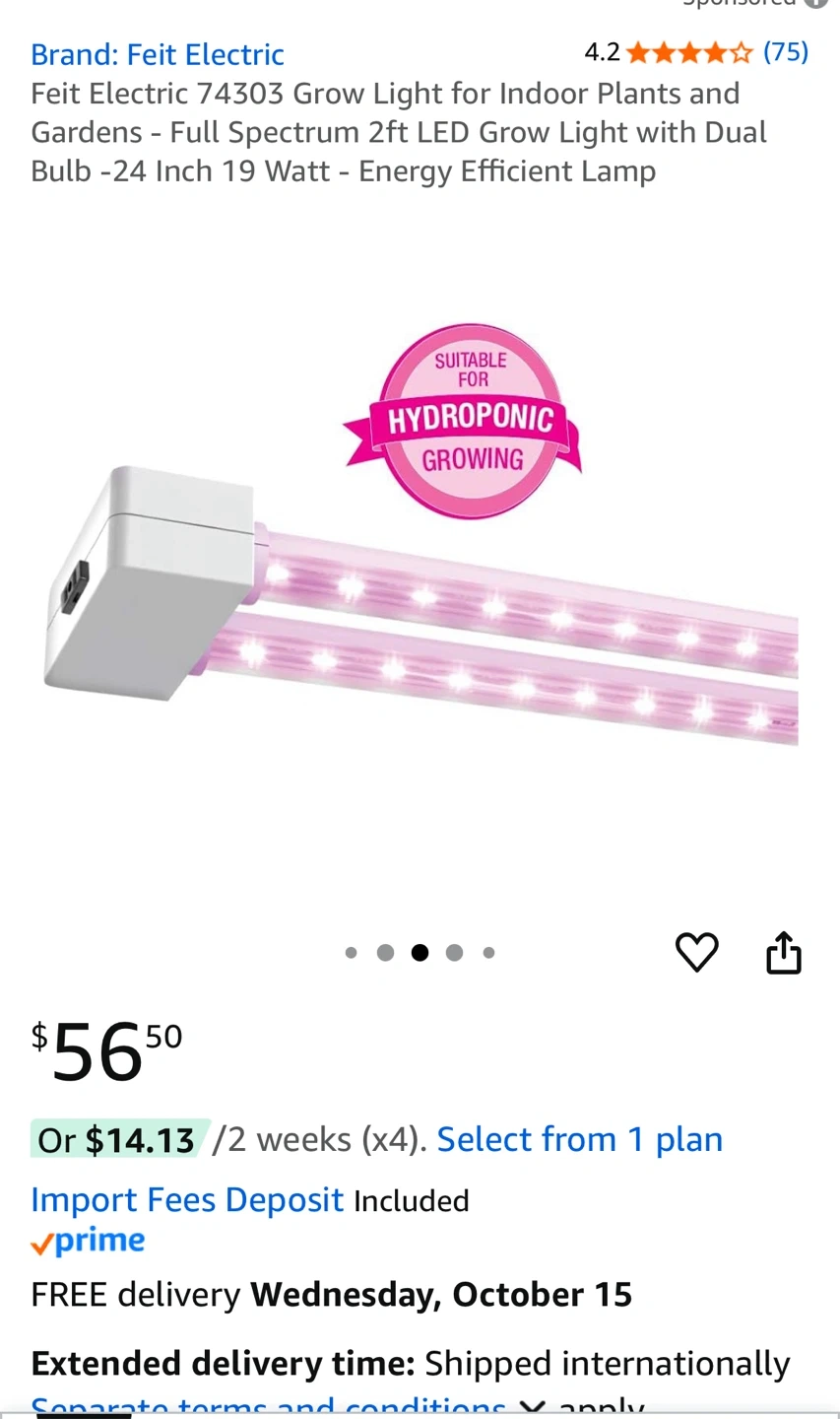 I'm selling a Feit Electric 74303 Grow Light for indoor plants and gardens. This is a full spectrum 2ft LED grow light with a dual bulb. It's a 19 Watt energy efficient lamp. Great for hydroponic growing! Pickup only at Hoover Park and 10th Line, Stouffville