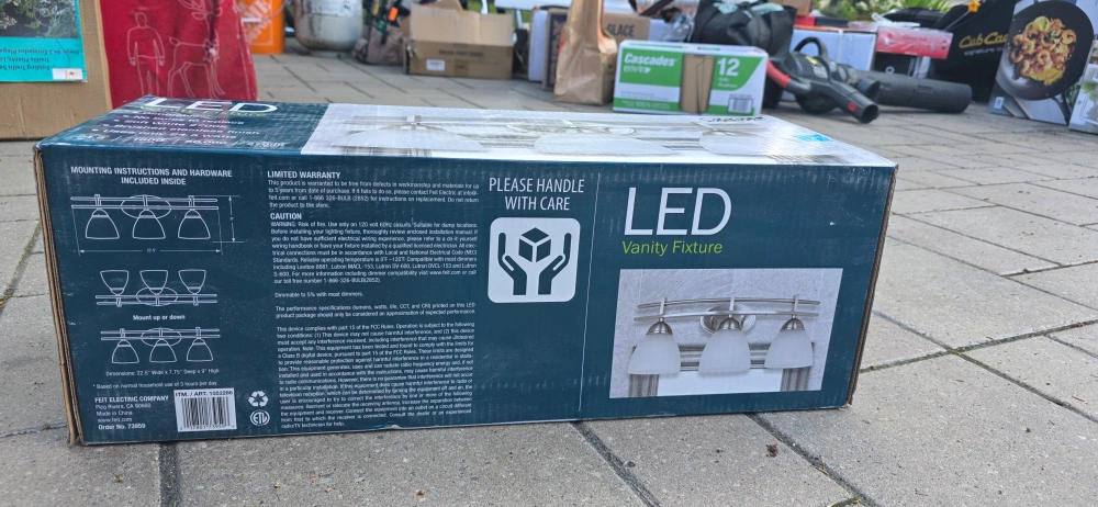Selling a brand new Feit Electric LED Vanity Fixture still in its original packaging! This dimmable fixture features a brushed stainless steel finish and emits a soft white 2700K light. It uses only 24.5 watts and has no bulbs to replace. Mounting instructions and hardware are included inside the box