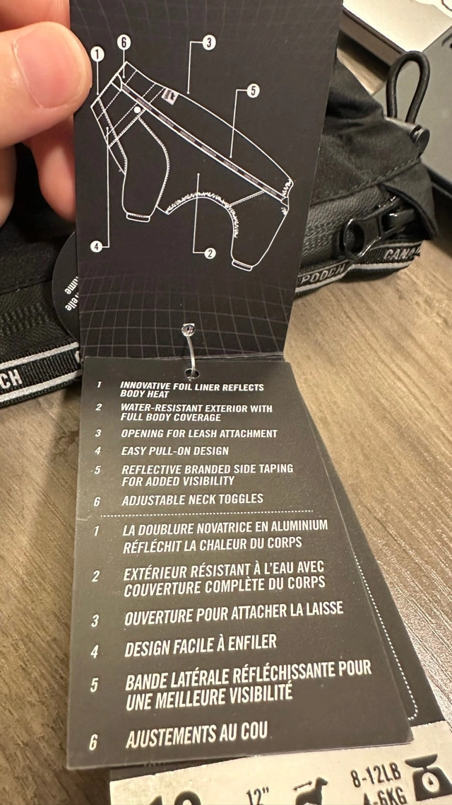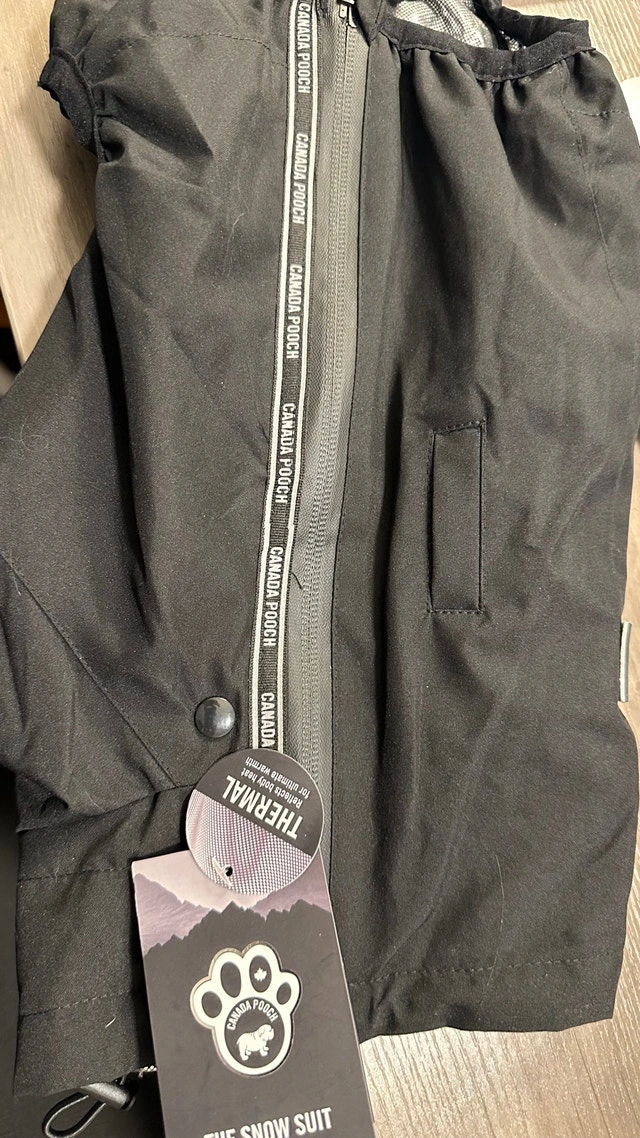 Keep your furry friend warm and stylish this winter with this Canada Pooch Snow Suit, size 12! Designed for ultimate warmth, this suit features a thermal foil liner to reflect body heat and a water-resistant exterior, perfect for those snowy adventures. It also has reflective branded side taping for added visibility and adjustable neck toggles for a snug fit. Features: Innovative foil liner reflects body heat, Water-resistant exterior with full body coverage, Opening for leash attachment, Easy pull-on design, Reflective branded side taping for added visibility, Adjustable neck toggles. This dog snow suit is in totally new condition and comes with all original tags. If you see this ad, it's still available!