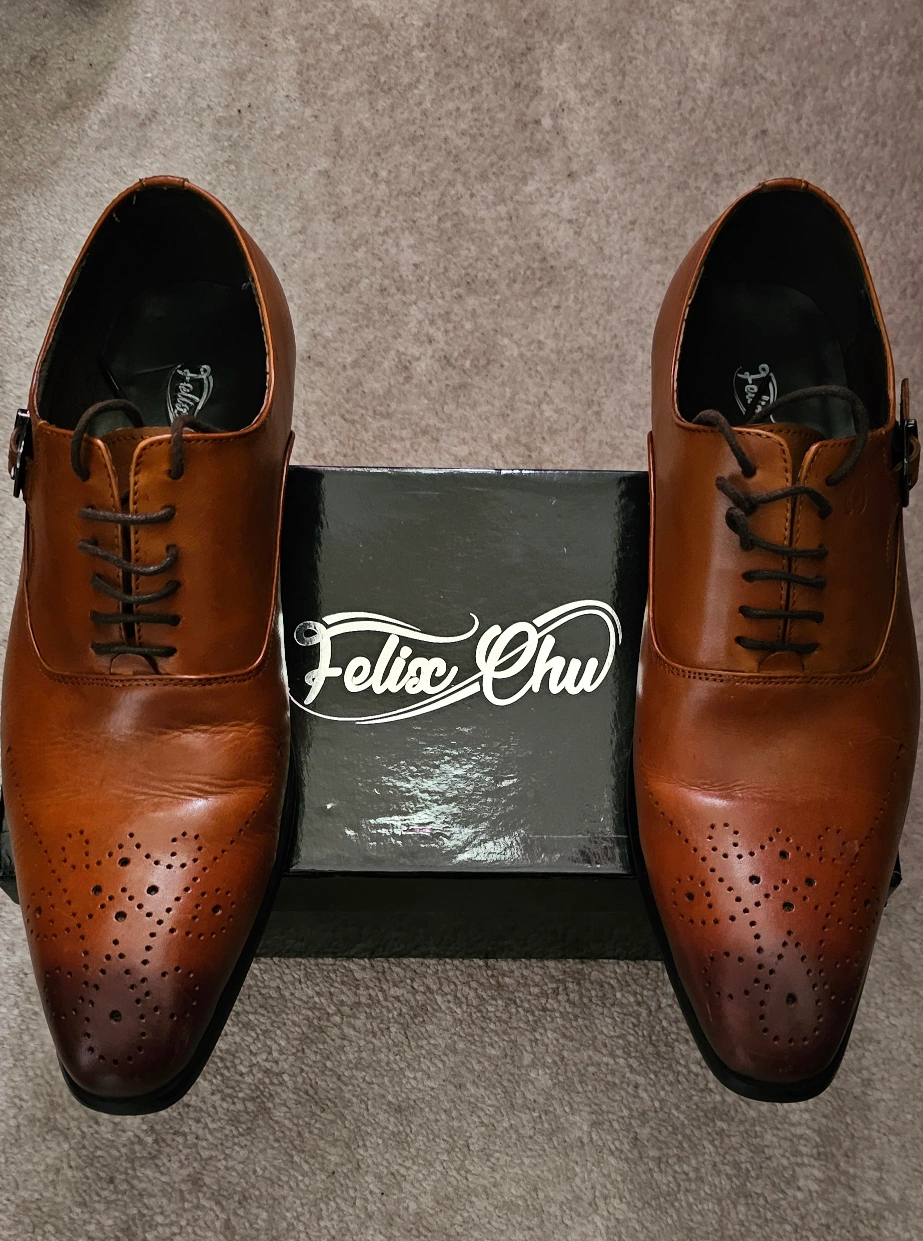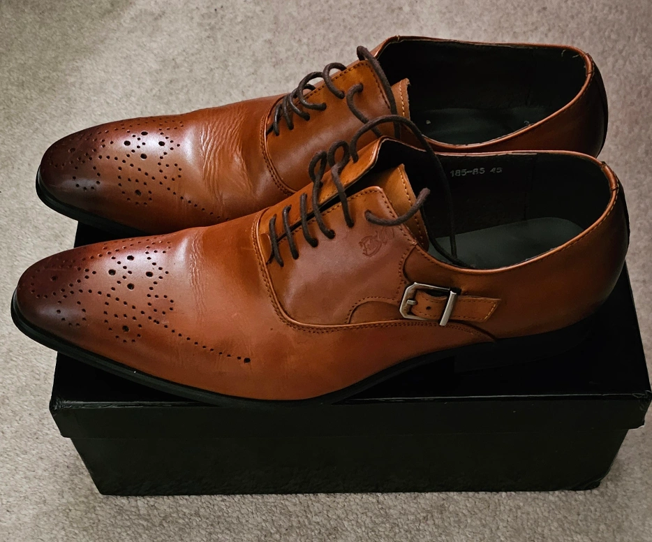 Brown leather dress shoes with a buckle accent. Size 45. Comes with the original box.