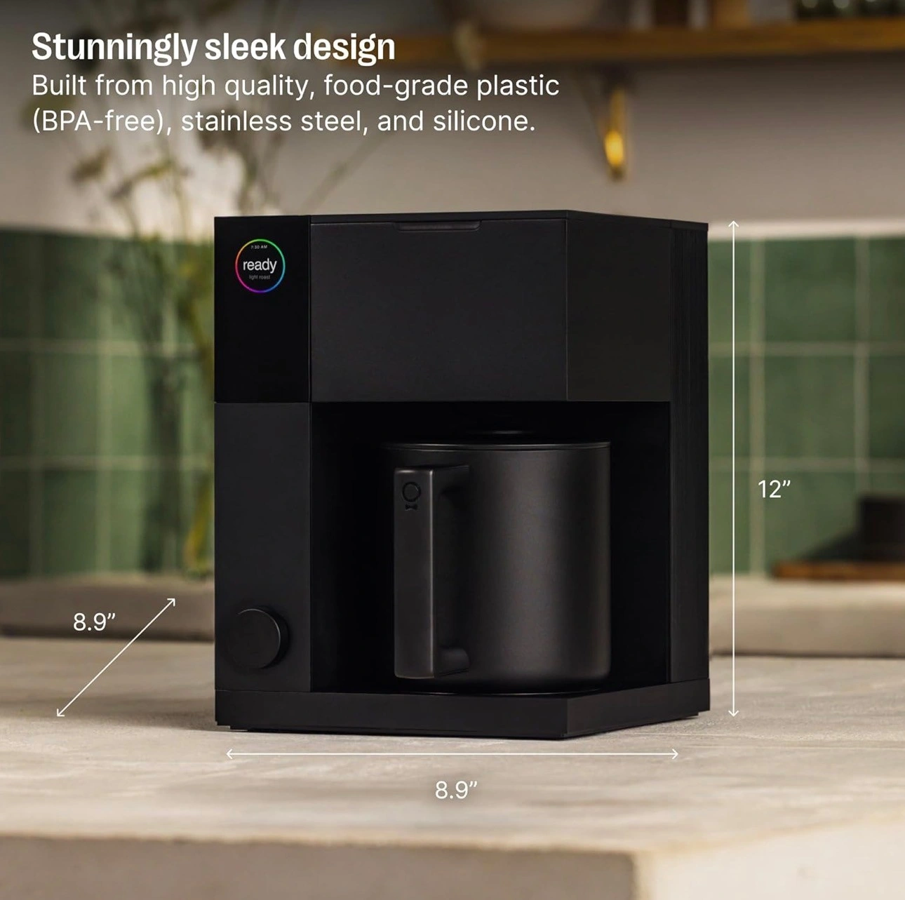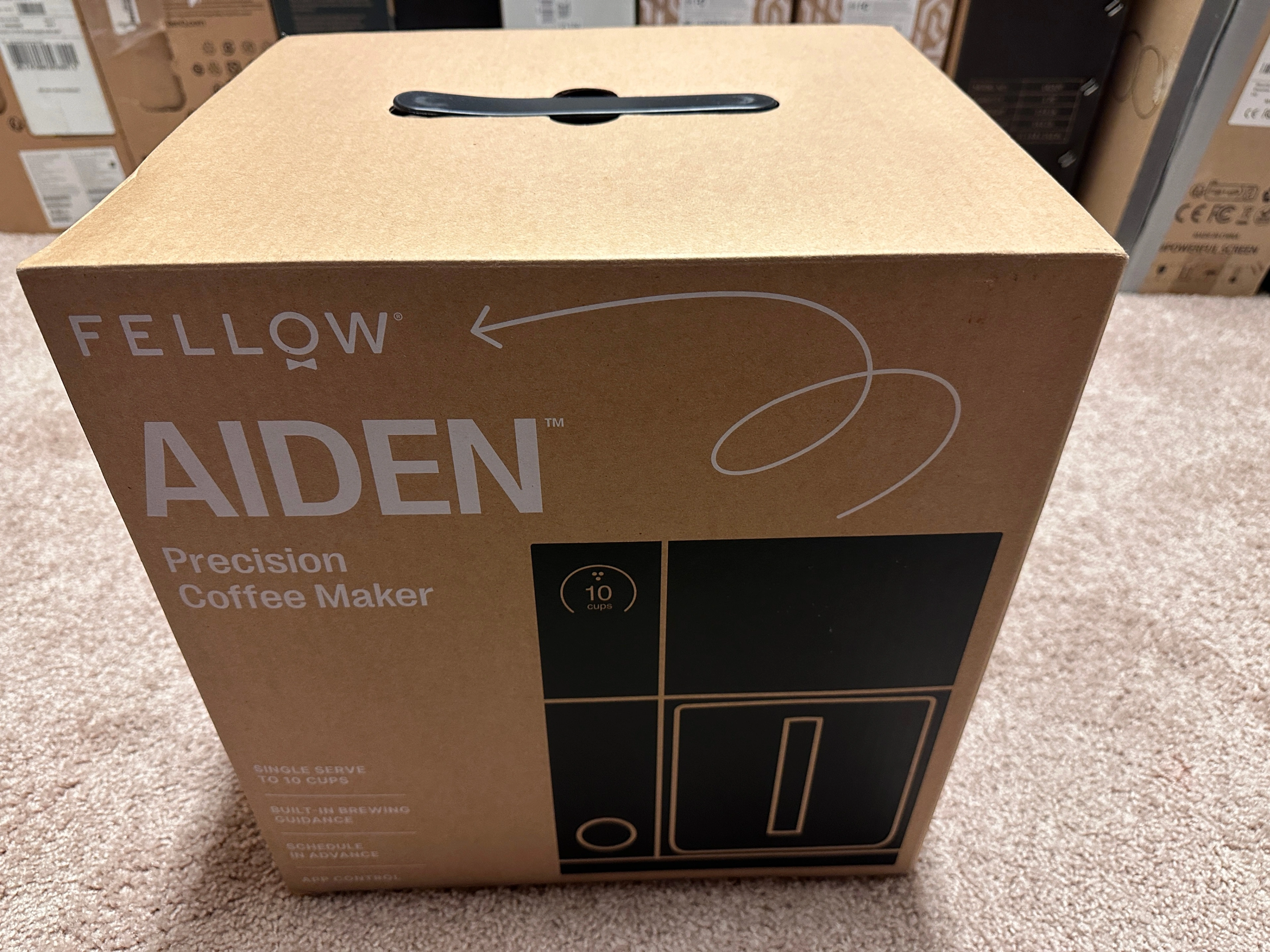306Fellow Aiden Precision Coffee Maker - 10-Cup Thermal Carafe, Built-In Brewing Guidance, Scheduling, Removable Water Tank, Matte Black NOTE: New in box with original stickers intact, not used EXCEPTIONAL QUALITY COFFEE: Aiden serves as your personal barista, perfecting temperature control, coffee-to-water ratios, and a built-in bloom cycle to achieve results you’d only expect at a cafe. You will taste the difference. EFFORTLESS ONE-BUTTON BREWING: Treat guests to double-take worthy coffee with the press of a button. For even more convenience, a drip-stop filter basket prevents mess while a removable water tank pops out for easy refilling at the sink. BUILT-IN BREWING GUIDANCE: Choose from brewing presets for light, medium, or dark roasts, cold brew, and more, all developed by our in-house experts. It even guides you on the exact amount of ground coffee needed based on your selected brew size. SINGLE SERVE + BATCH BREW: Aiden has interchangeable single serve and batch brew baskets and a dual shower head for even water distribution across all volumes. Seamlessly brew one to 10 cups of coffee without compromising quality or taste. CREATE + SHARE BREW PROFILES: Think of a brew profile like a recipe. Create your own brew profiles, customizing as many (or as few) brew variables as you’d like. With the Fellow companion app you can also create and share your custom brew profiles. SCHEDULE IN ADVANCE: Schedule brews for when you want them ready—not when they start. Set it for 7 AM, and Aiden ensures it’s brewed right on time. CLEVER FUNCTIONALITY Aiden’s silicone seal protects cabinets from steam damage, while the discrete cord wrap keeps countertops tidy. The heat-retentive thermal carafe ensures your coffee stays warm for hours, wherever you enjoy it.