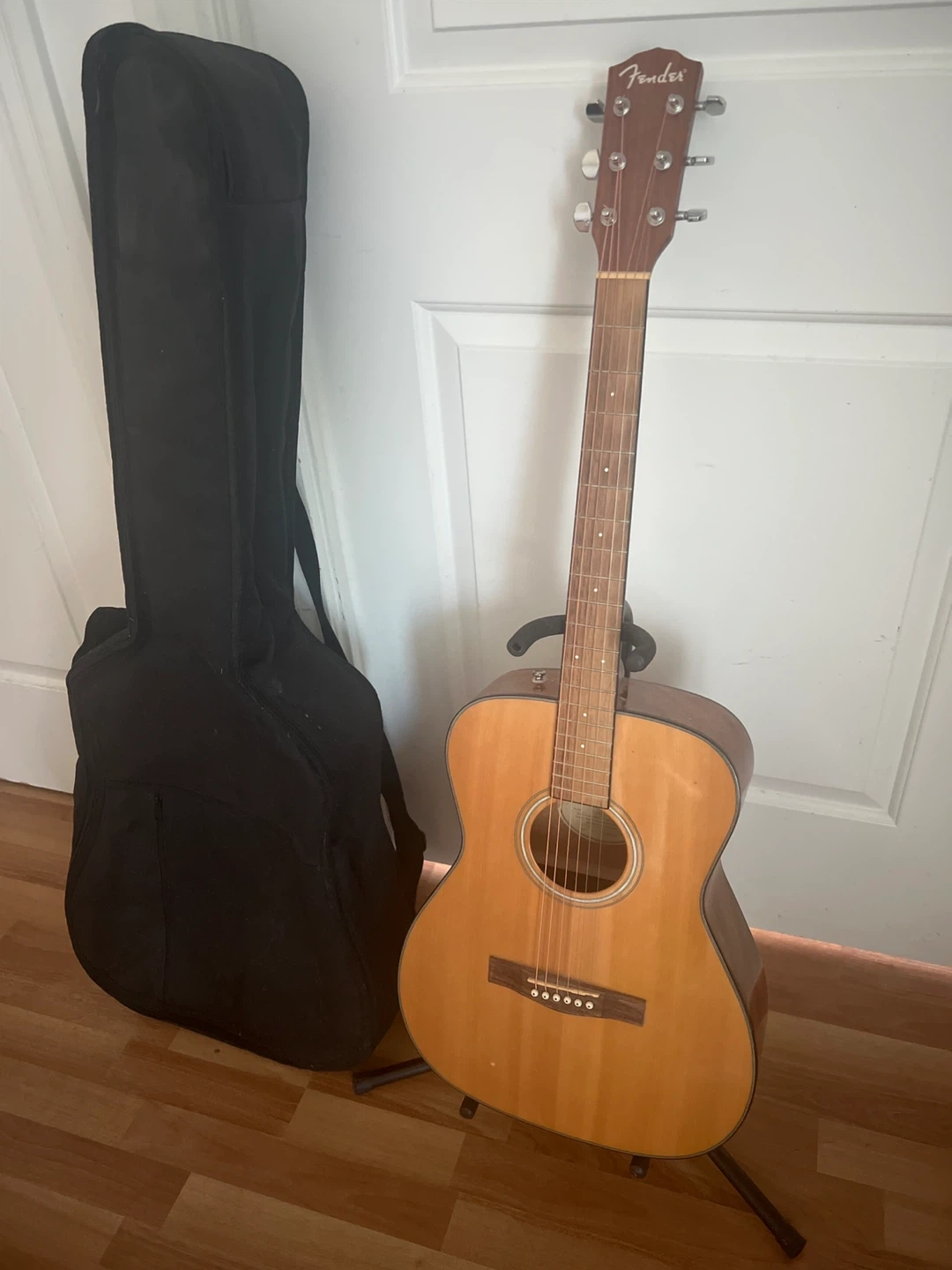 Selling a Fender acoustic guitar. It comes with a gig bag for easy transport and storage. Great for beginners or anyone looking for a reliable acoustic guitar to play! Feel free to reach out if you have any questions.