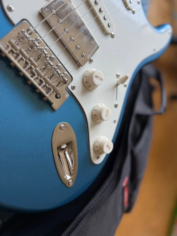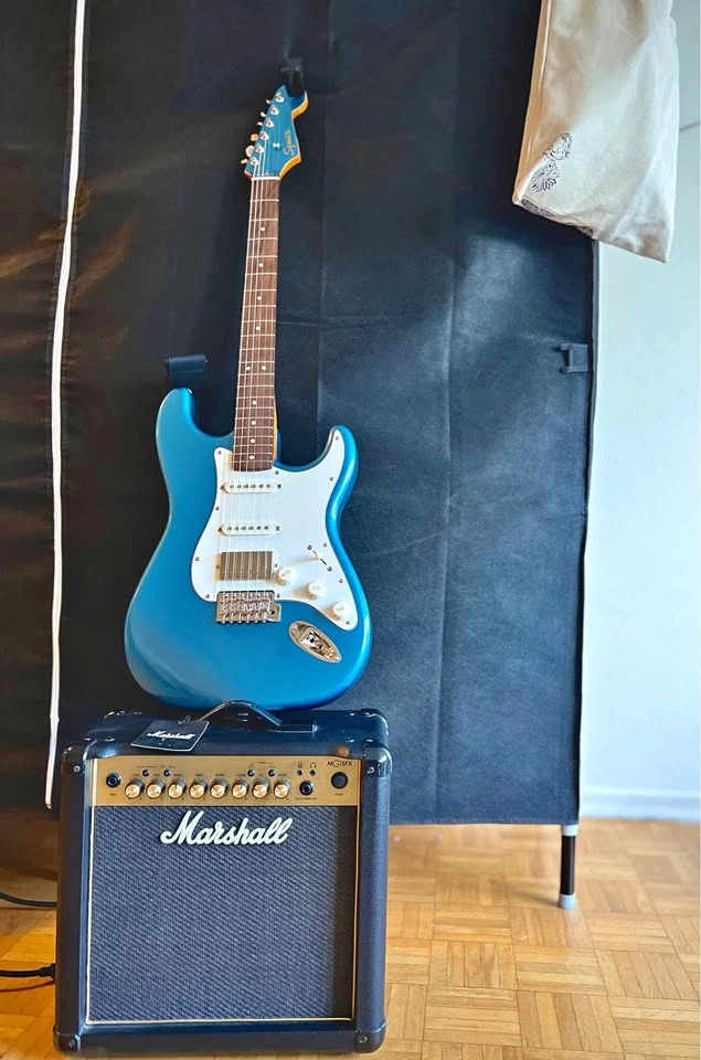 Squier Classic Vibe '60s Stratocaster in Lake Placid Blue with all accessories. Hardware: Bridge: 6-Saddle Vintage-Style Synchronized Tremolo Control Knobs: Aged White Plastic Hardware Finish: Nickel Neck Plate: 4-Bolt Squier® Pickguard: 3-Ply Parchment Pickup Covers: Aged White Strings: Nickel Plated Steel (.009-.042 Gauges) Switch Tip: Aged White Tuning Machines: Vintage-Style Marshall Amplifier: Features: • Custom 8 inch speaker • Clean, Crunch, OD1, OD2 channels • Modern digital effects • Line In for jamming along with tracks • Emulated headphone output Specifications: • Range: MG Gold • Technology: Solid State • Channels: 4 (store and recall) • Output wattage: 15w • Outputs: 1 x 3.5mm jack headphone out • Inputs: 1 x 1/4" jack instrument input, 1 x 3.5mm Aux in • Controls: Gain, clean/crunch select, bass, OD1/OD2 select, middle, treble, reverb, volume, tuner, tap, store, FX select, master volume • Effects: Reverb, phaser, flanger, delay, chorus • Effects loop: No • Speaker configuration: 1x8" • Speaker model: Custom speakers (8ohm, 15w) • Unit impedance: 8ohm • Footswitch: None • Cable: Fixed power cable included • Weight (kg): 7.7 • Width (mm): 385 • Height (mm): 380 • Depth (mm): 210 Let me know if you're interested!
