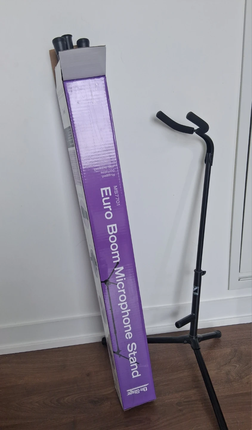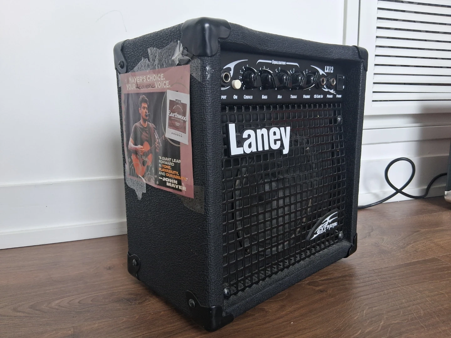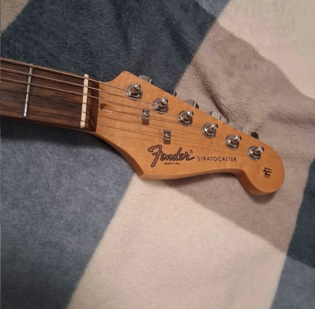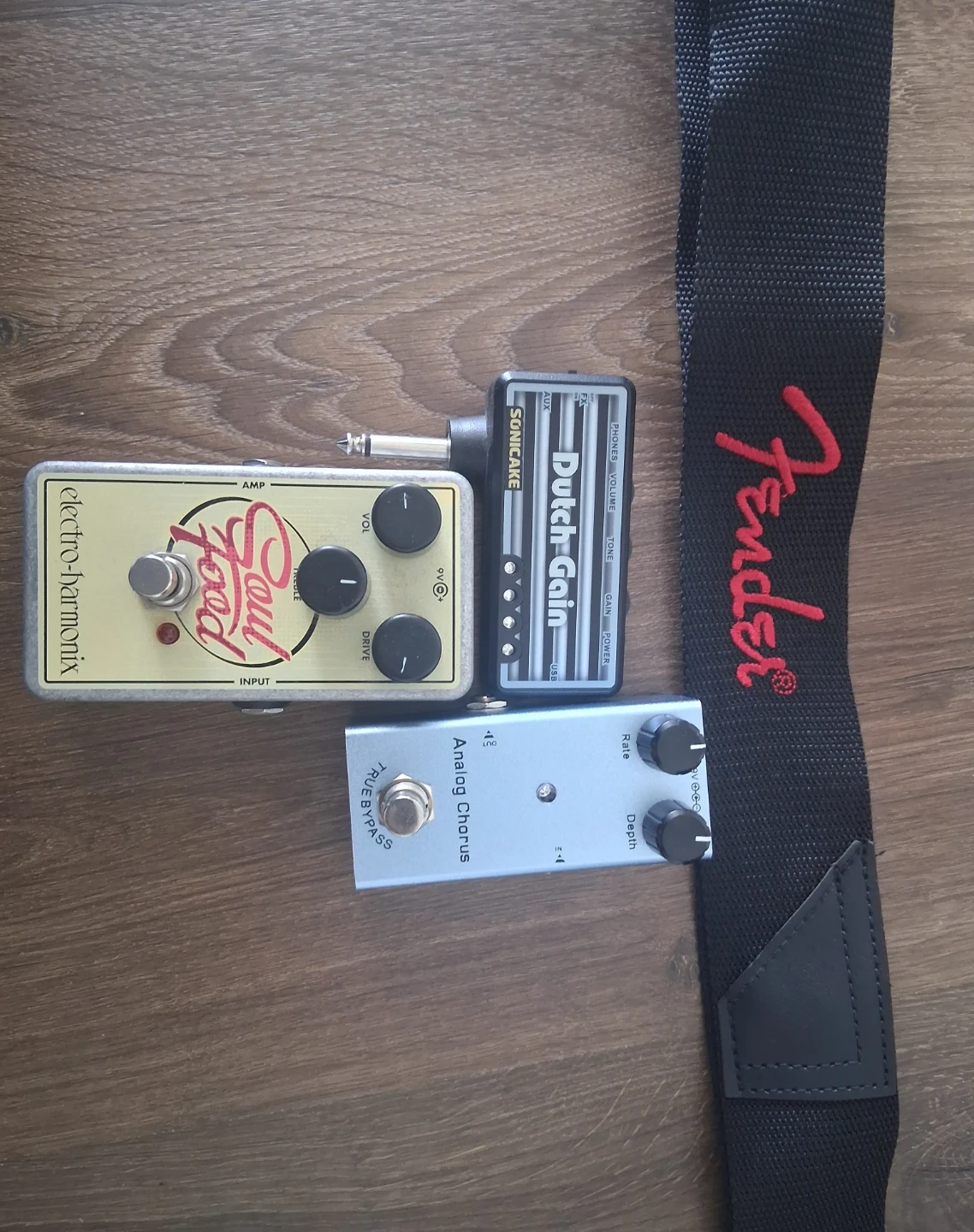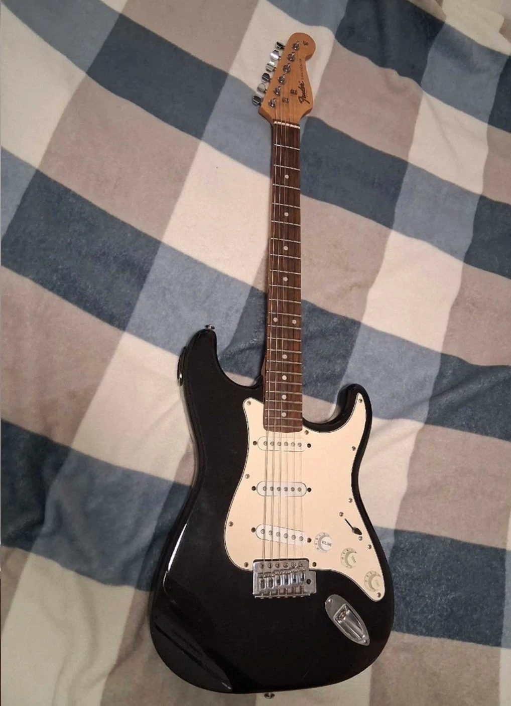Used it for home studio. Most of the things were purchased from Long McQuade, Steve's, Archambault (Montreal). More photos by request. Fender Stratocaster replica, it got 22 steel frets(never need to change them), body alder, just like premium Fender. Staying in tune for long period of time. Comfortable neck. Affordable option for someone who want to explore how good Stratocaster sounds like before buying "Made in California" Laney amplifier LX12, builded crunch. Amp for headphones, builded reverb Soul food pedal with original box from Long McQuade Analog chorus pedal 3 Guitar cables 2 Microphone cables 4 Guitar books Guitar stand Gig bag Fender strap Adapter for multiple pedals New pack of strings Pop filter Microphone stand Microphone holder Price for everything Final sale