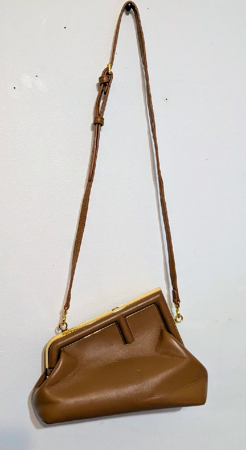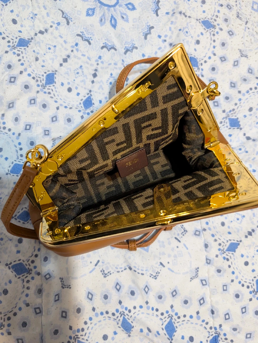 23This is a Fendi handbag made in Italy. It features the classic Fendi logo pattern on the interior lining. The exterior is a beautiful brown leather with gold-tone hardware. It's a stylish and elegant accessory!