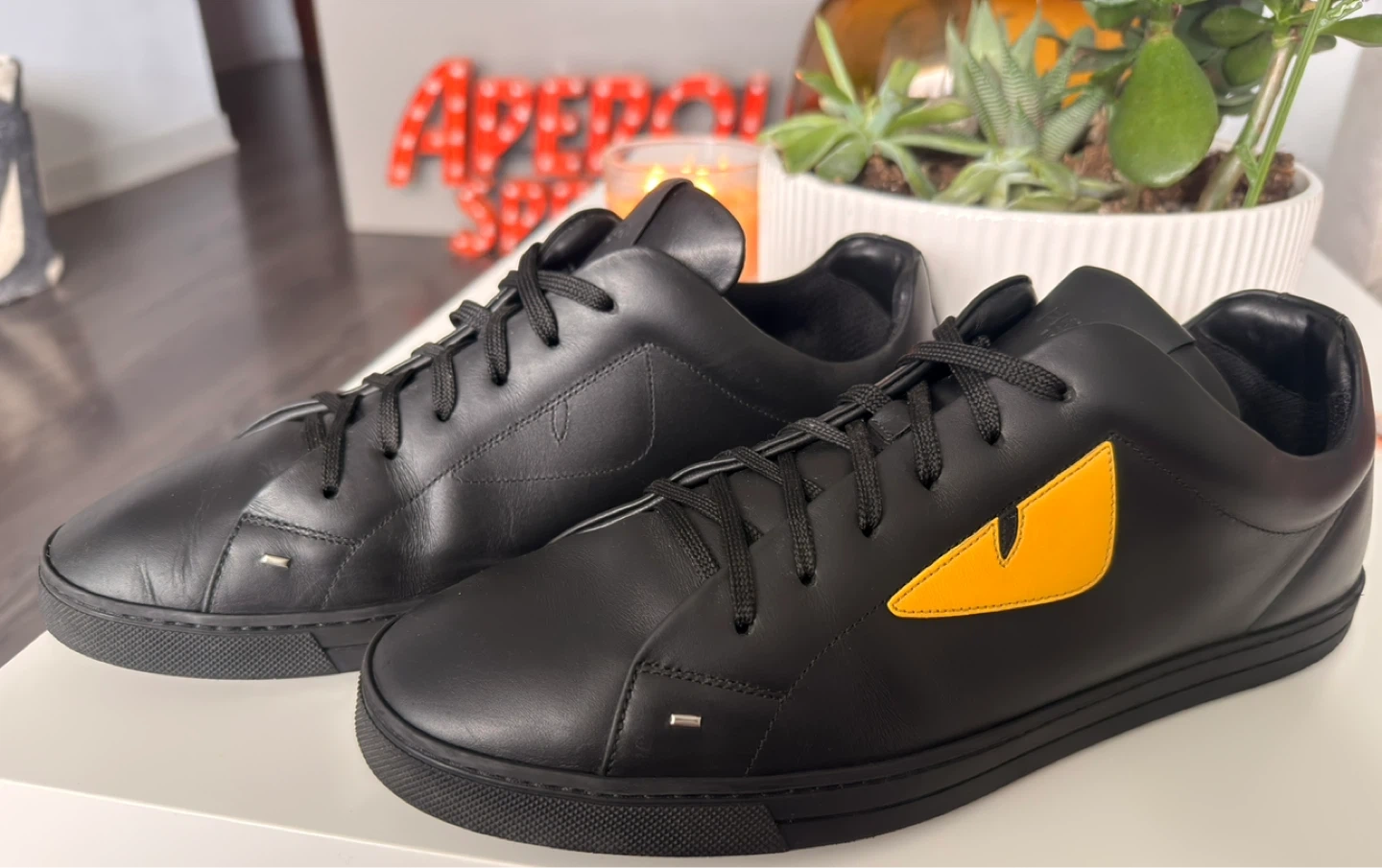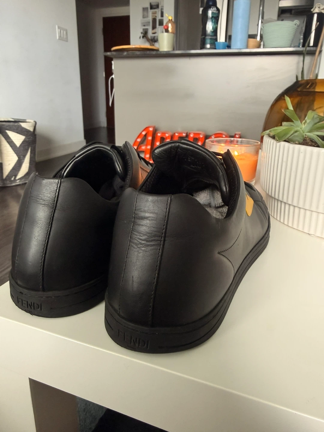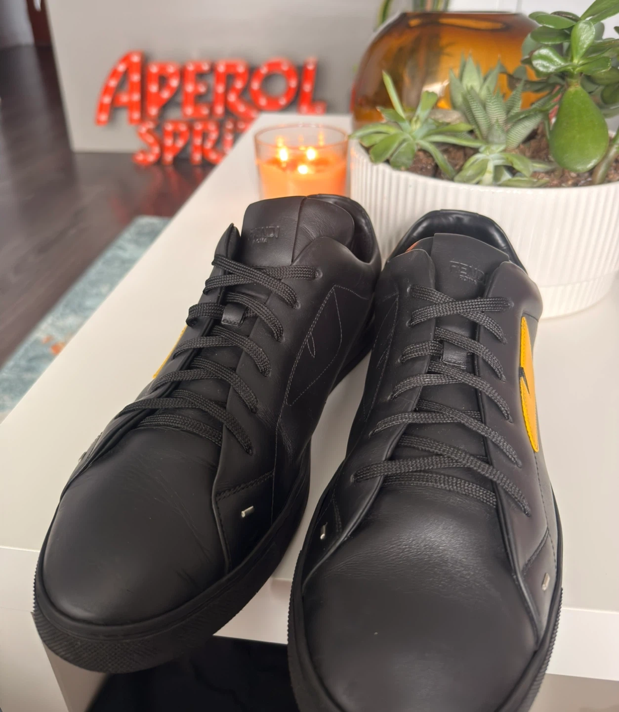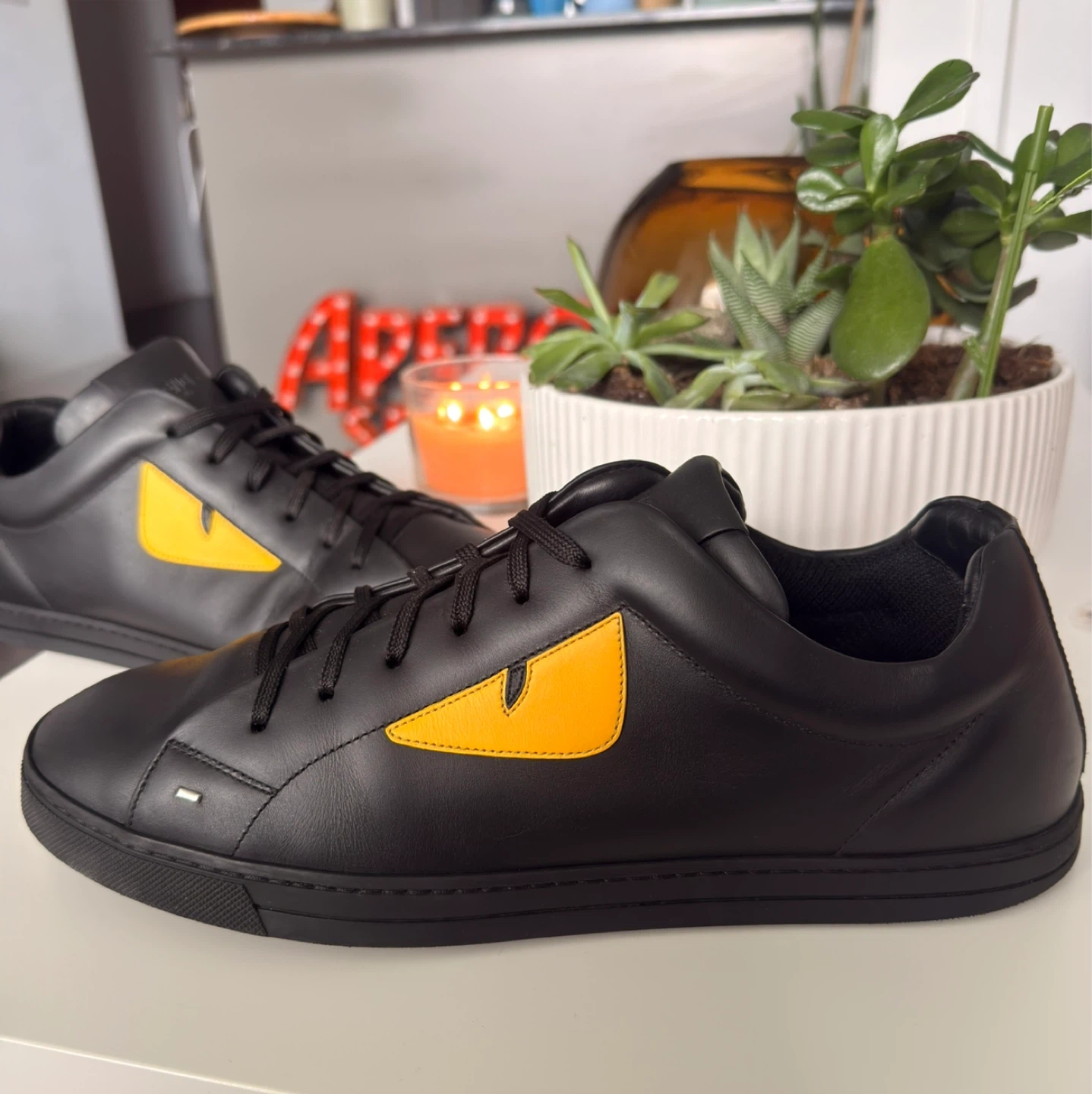 Selling a pair of Fendi Monster Eye sneakers! These stylish sneakers are in great condition and feature the iconic monster eye design in yellow. They're a sleek black leather and would be a great addition to your wardrobe!