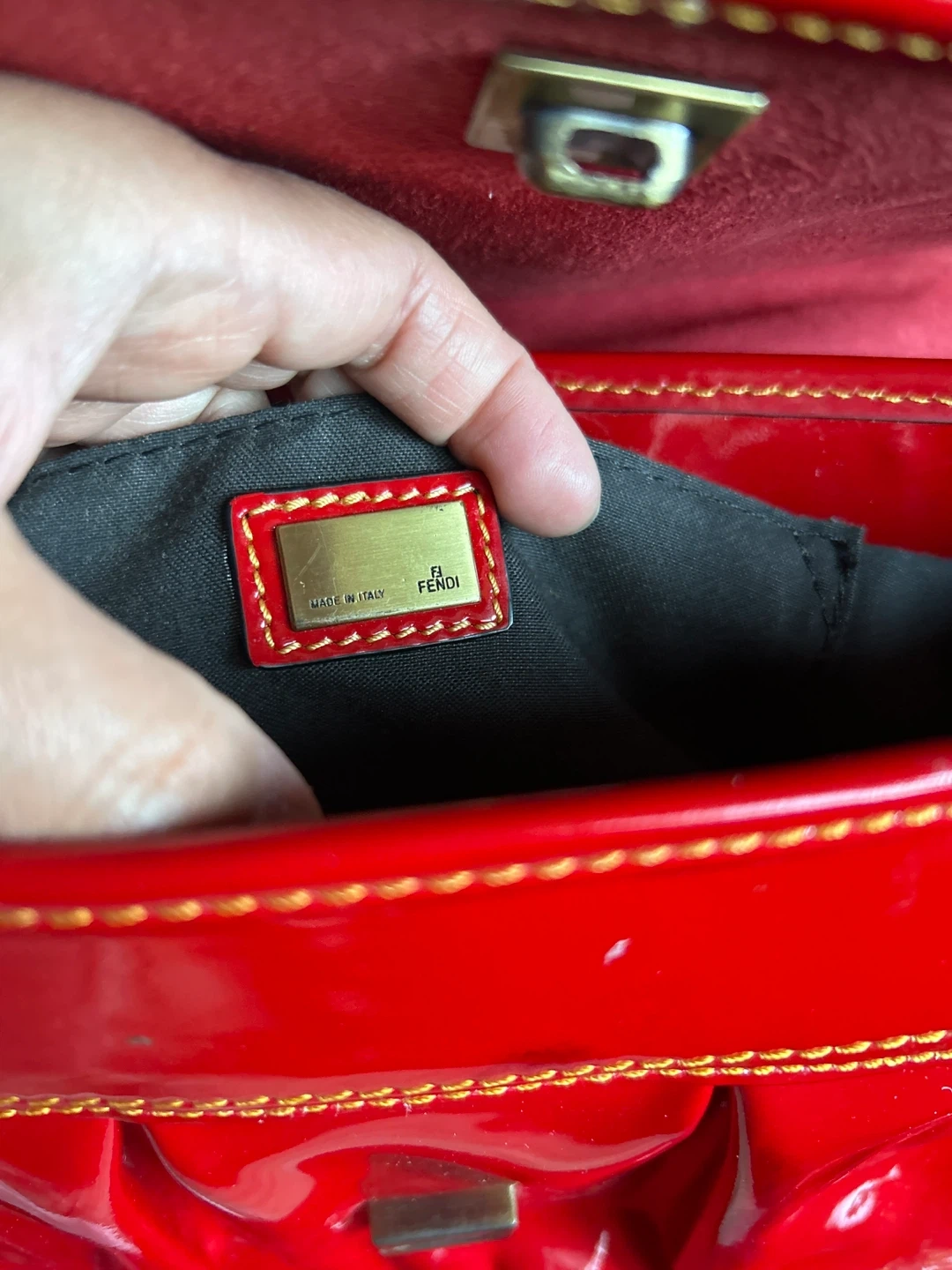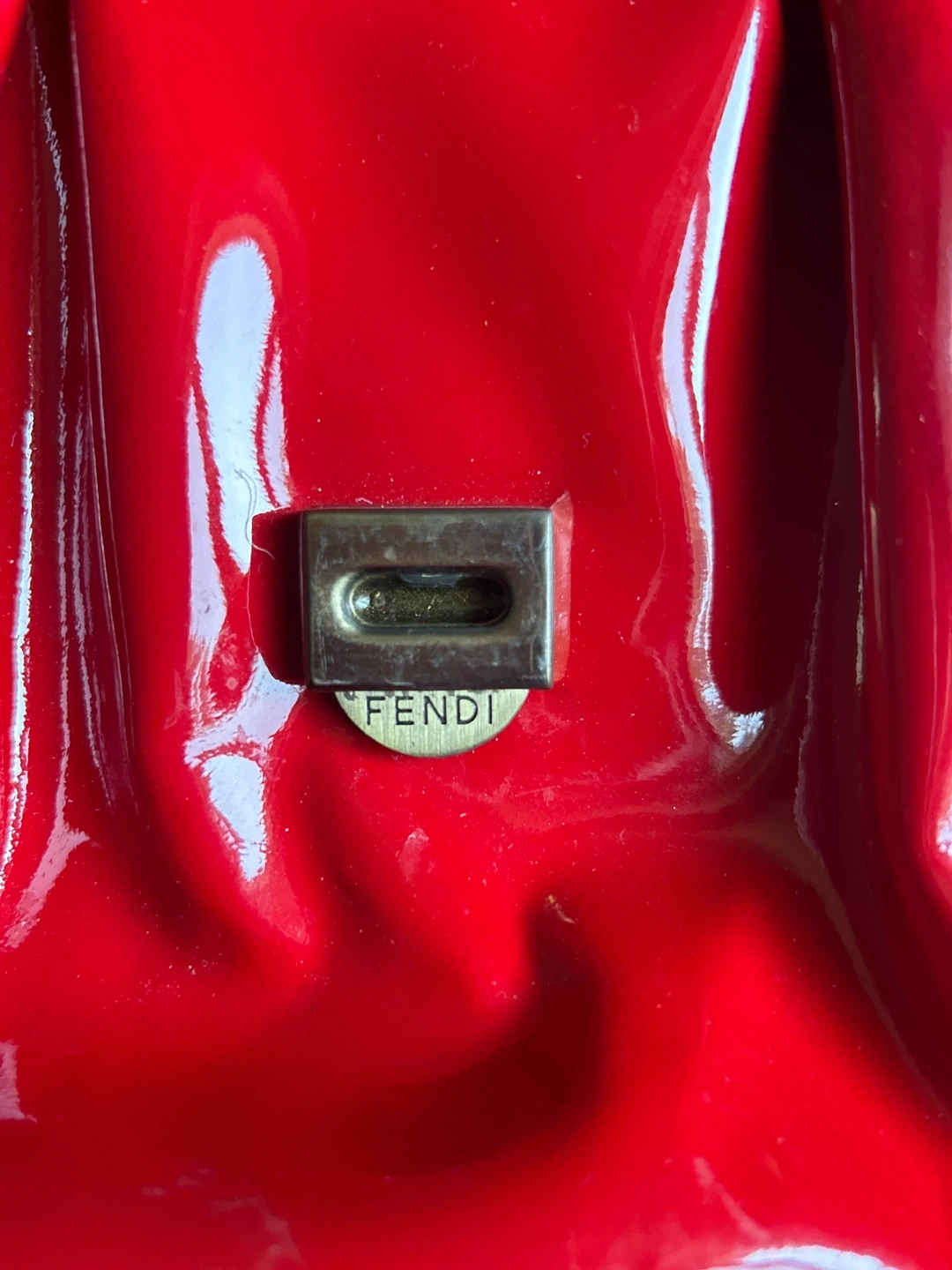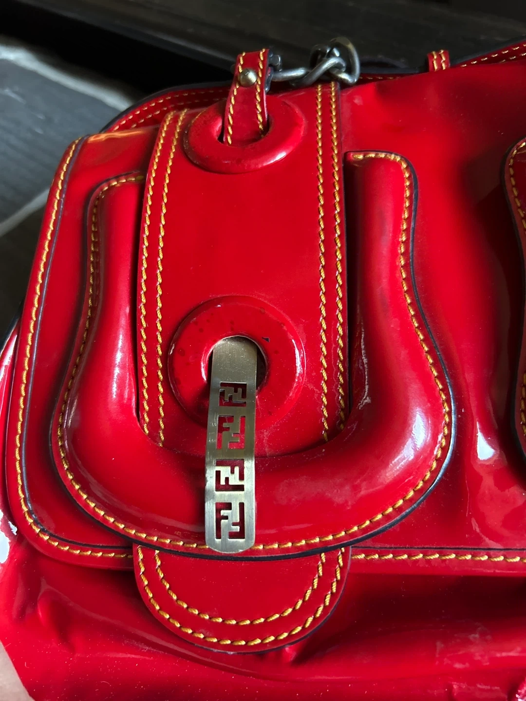 This one is a head turner. Selling a beautiful Fendi handbag in a striking red patent leather! It's a real statement piece with unique detailing and the iconic Fendi logo. The interior is lined with black fabric and features a small tag with the serial number. Minor issue at the back and easy fix- two screws were unscrewed. Minor stains in front