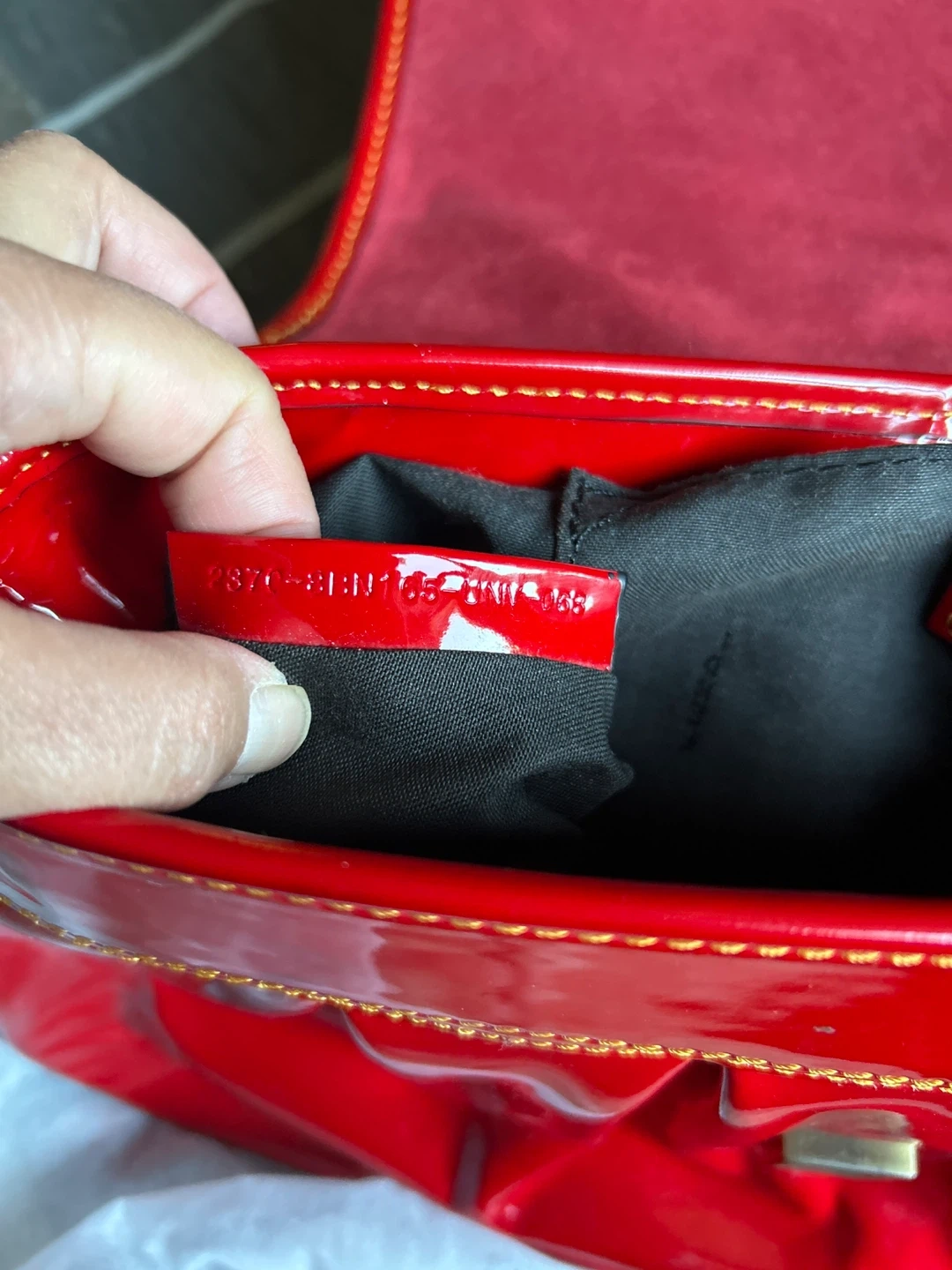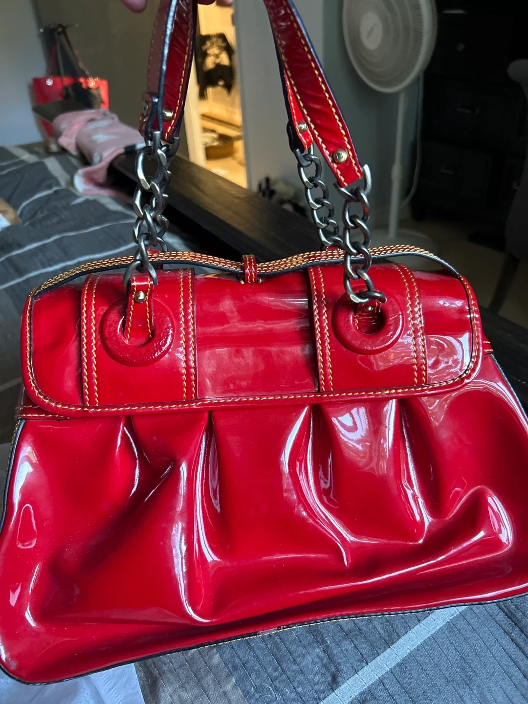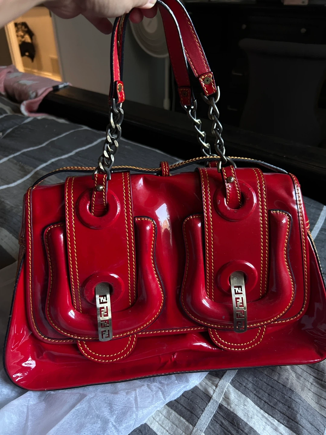 This one is a head turner. Selling a beautiful Fendi handbag in a striking red patent leather! It's a real statement piece with unique detailing and the iconic Fendi logo. The interior is lined with black fabric and features a small tag with the serial number. Minor issue at the back and easy fix- two screws were unscrewed. Minor stains in front
