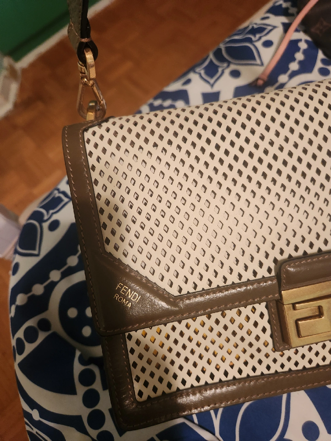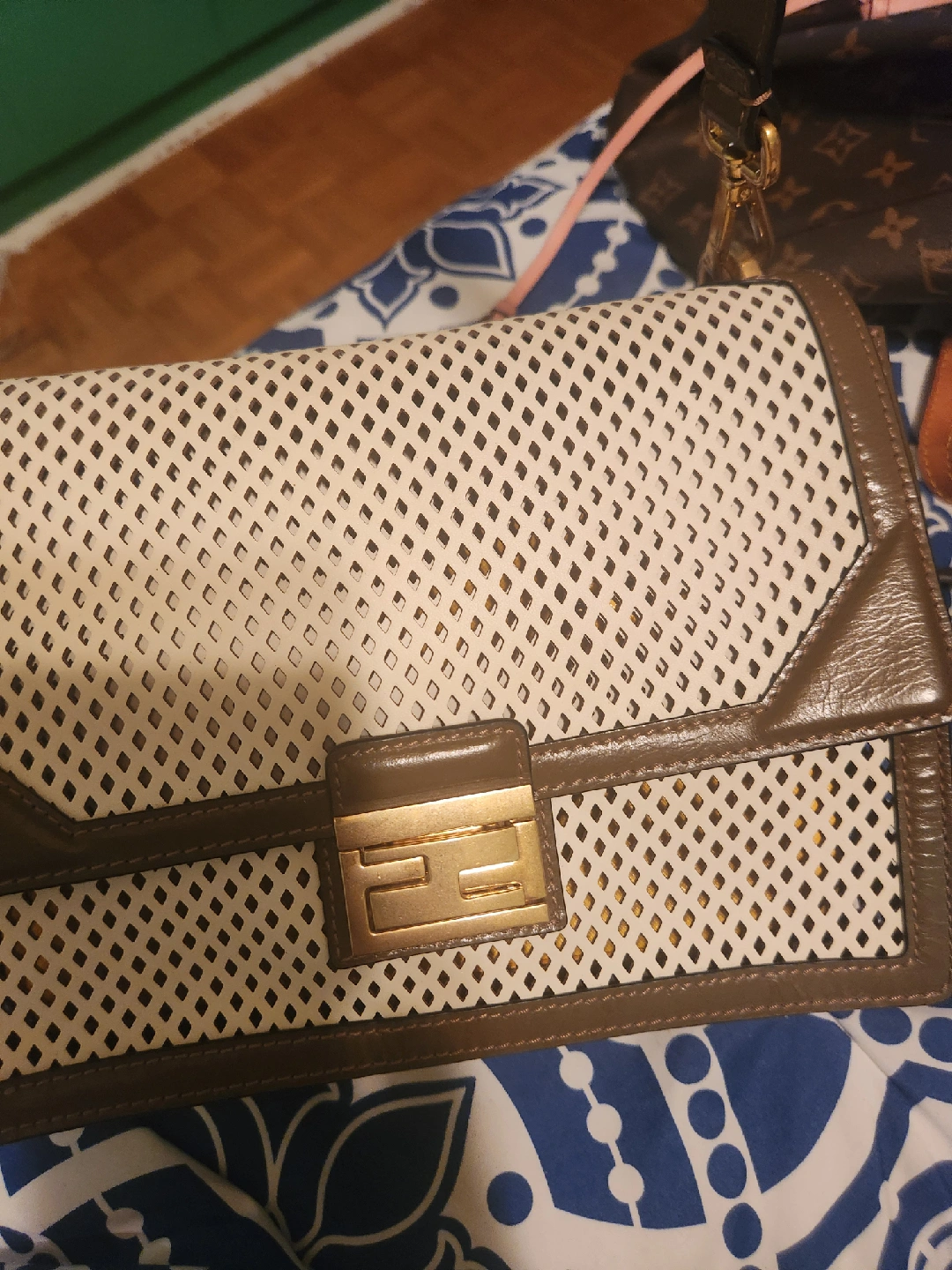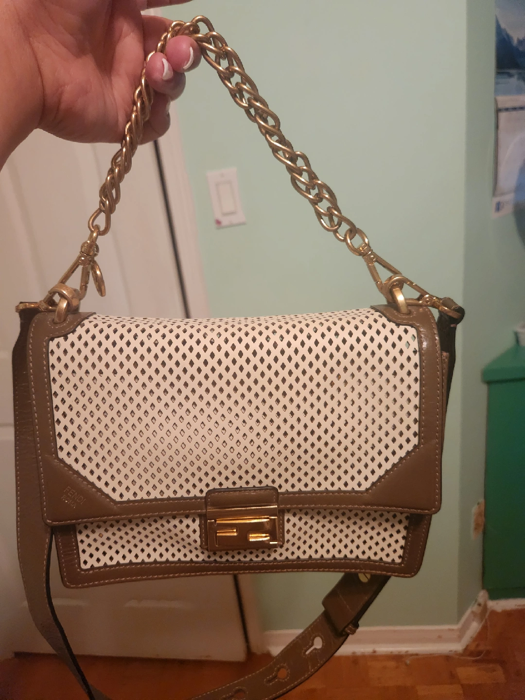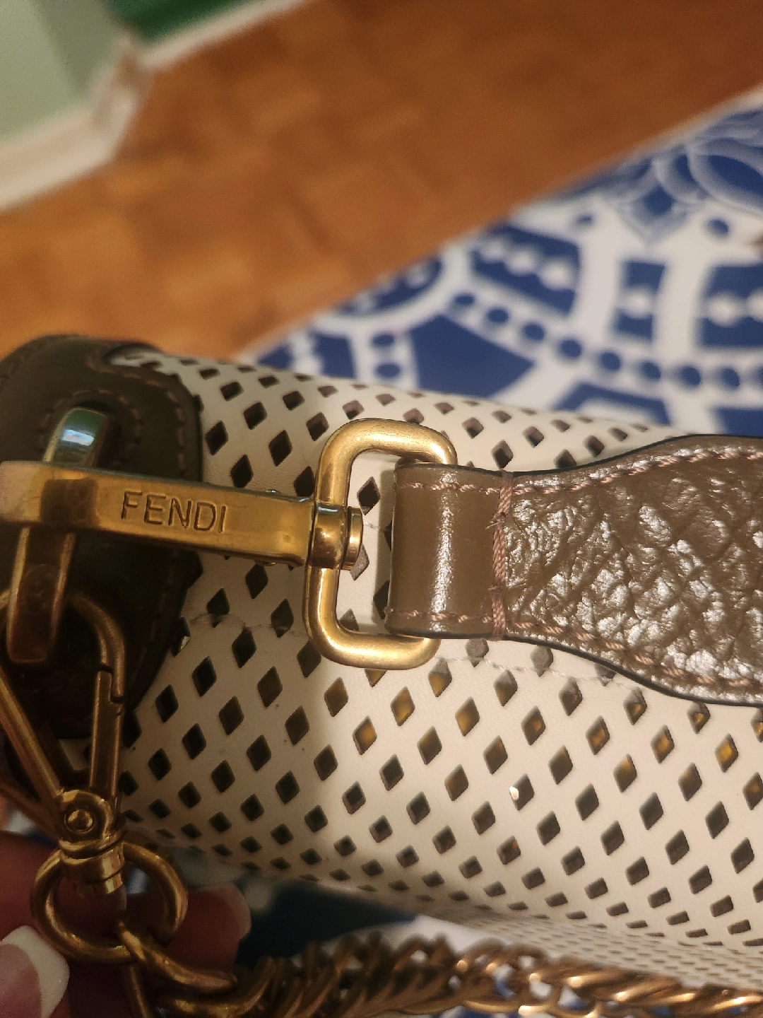 Selling a stylish Fendi Roma shoulder bag. It features a unique perforated design with leather trim and a gold-tone chain strap. Perfect for adding a touch of luxury to any outfit!