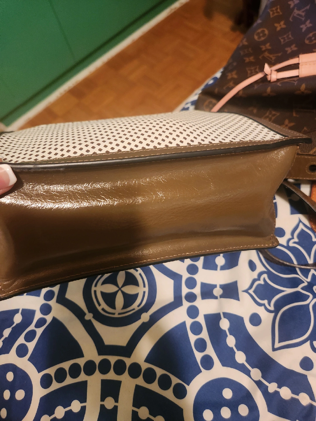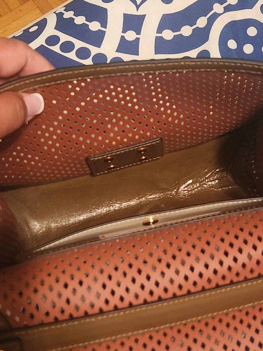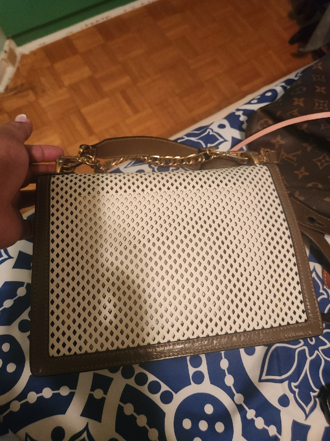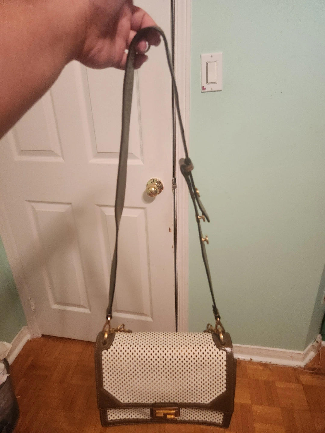 Selling a stylish Fendi Roma shoulder bag. It features a unique perforated design with leather trim and a gold-tone chain strap. Perfect for adding a touch of luxury to any outfit!
