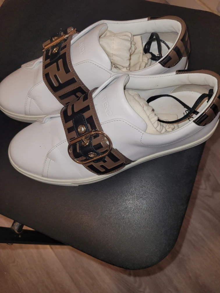 20These Fendi slip-on sneakers are made of white leather and feature a distinctive brown and black Fendi logo strap with a gold buckle. They're a stylish and comfortable choice for everyday wear. There are some signs of wear. Also no problem to meet by store for authentication of the shoes.